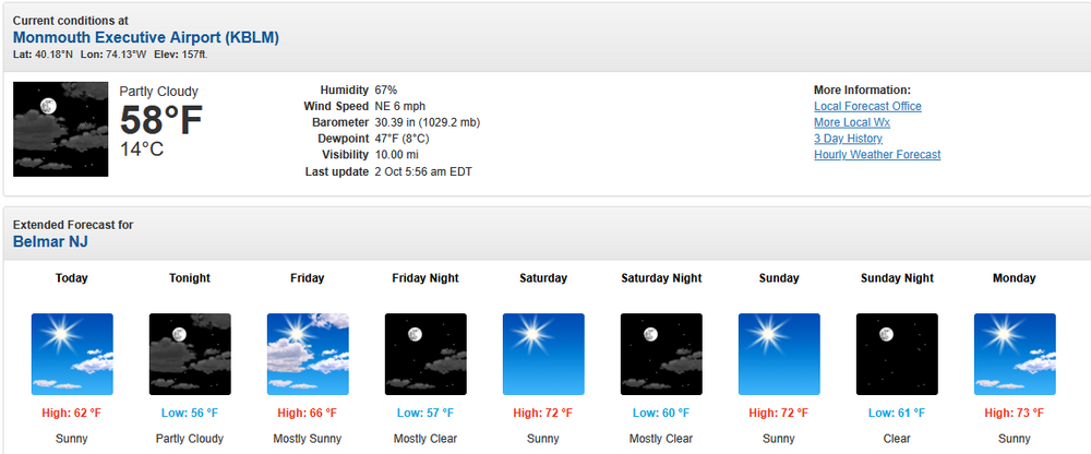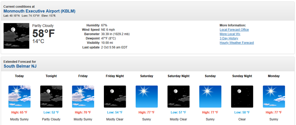 The forecast is inconsistent with the AFD, which states: .SHORT TERM /FRIDAY NIGHT THROUGH SATURDAY NIGHT/... Our expansive high pressure system remains the dominant weather feature through the short term period. This keeps the tranquil weather pattern going into the weekend. Friday night and Saturday night look mostly clear with minimal cloud cover. During the day Saturday, it is a mostly sunny day. Highs on Saturday will be in the mid to upper 70s. The NBM has consistently shown highs of 77°-79° for Saturday and Sunday. Moreover, if one uses "South Belmar" (Lake Como) and "West Belmar," one gets the warmer forecast. Belmar: South Belmar: West Belmar: