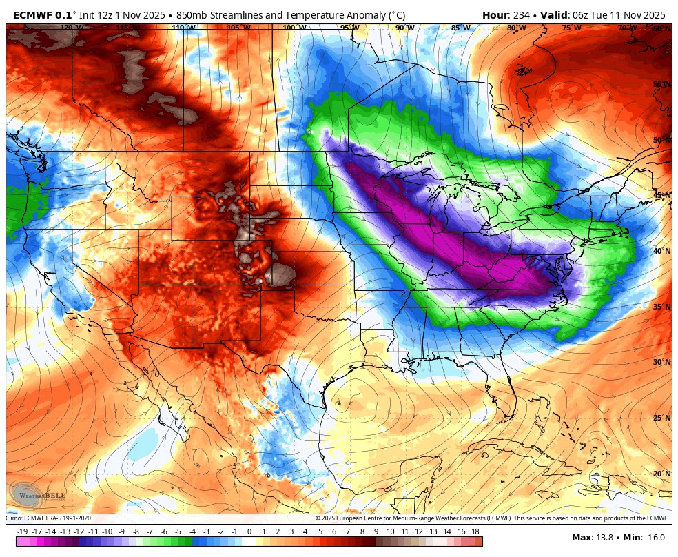 First cold airmass arrives near November 10th and the 11 th. Could be a rather intense cold frontal passage. Warmth prior to this, with next Saturday having the potential to hit 66 to 67 degrees. This Wednesday highs near 63 to 65.