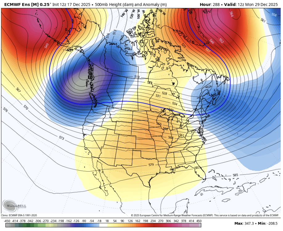 The Euro has a similar look but is displaced a little further north & east with mostly rain for CTP around Christmas. The GFS has been bouncing around today. The general idea of a wave tracking near us is there sometime around Christmas Day, but the details need resolved as the week goes on. Hopefully we end up on the right side of the boundary to get a couple of inches of snow to a mix if we get the right track & the cold in the northeast can hold in enough east of the mountains. -