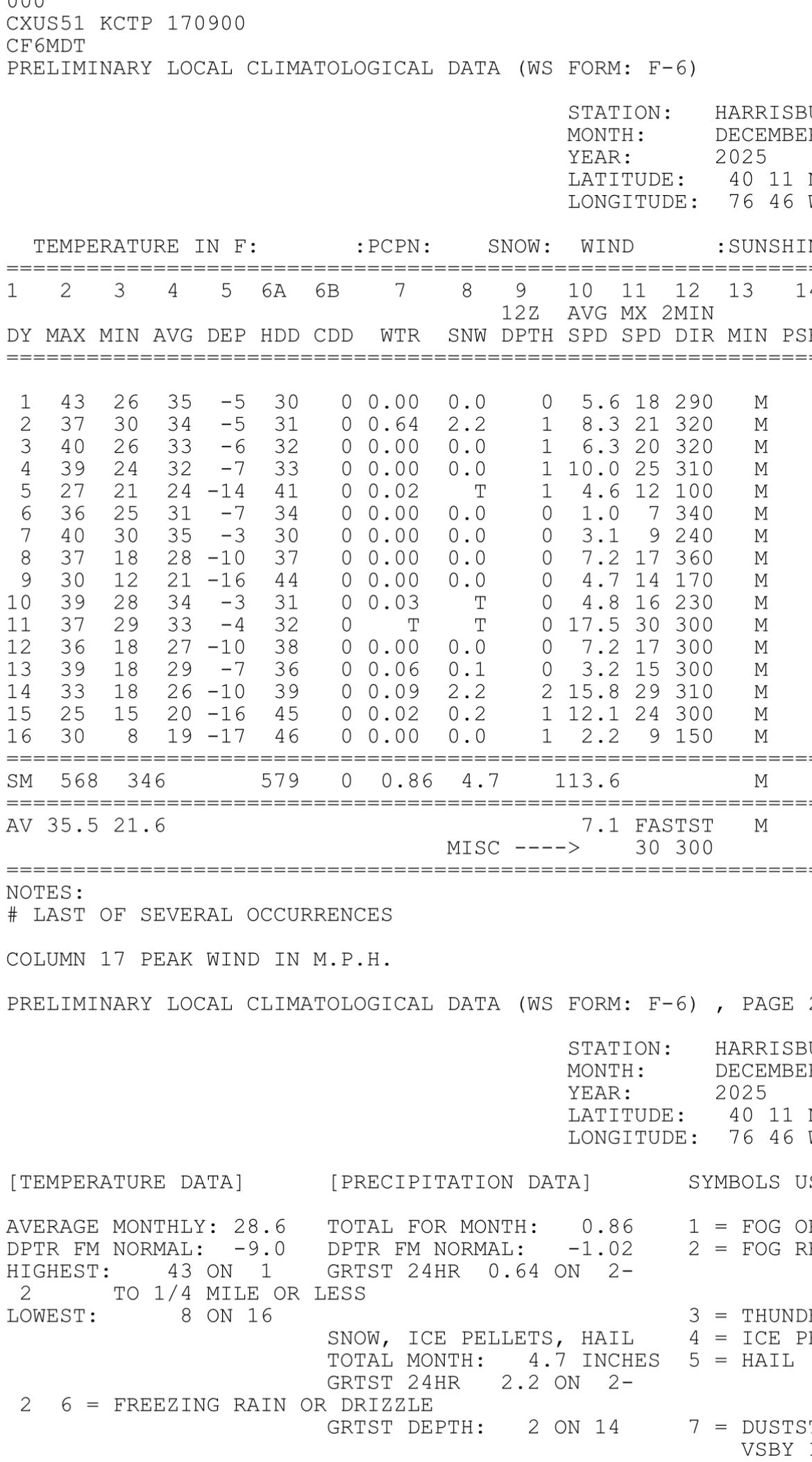 It is truly remarkable that MDT is running 9 degrees below normal temperature for the month through 12/16. What a cold stretch, along with above normal snow for the season to date at 4.7 inches. Great start to the season & hopefully we are on our way to a good Winter that is overdue for many of us. -