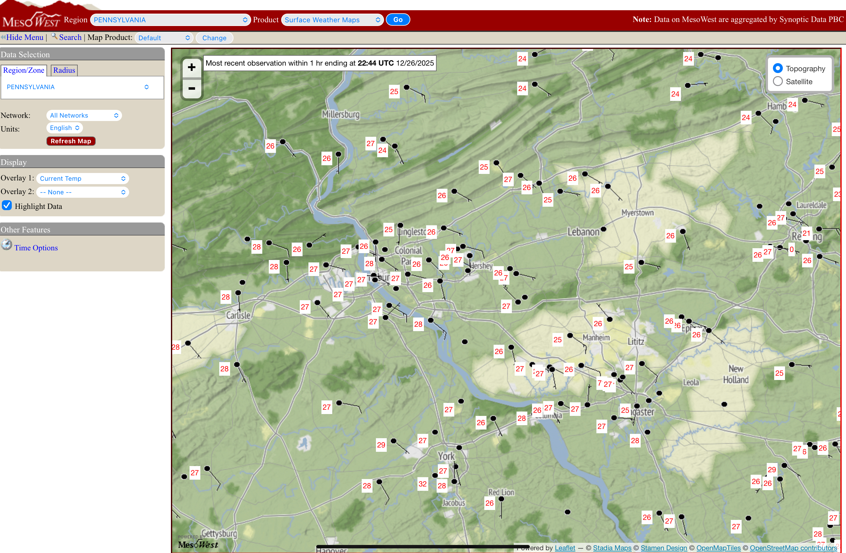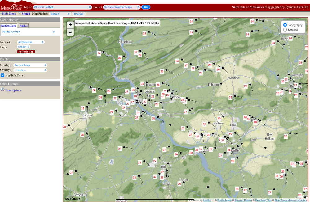 You had the last gasp of the extreme warmth that had been over the Ohio valley up to the early stages of the winter storm that developed over PA. I think Latrobe PA also maxed at around 57 F during the day. As you know it was well above 60 F in KY and parts of s IN-IL for a couple of days leading up to the Boxing Day storm in the northeast. That warmth is going to make one last run eastward on Monday before being suppressed further south. I would expect some parts of the MA to max out in low 60s by Monday afternoon-evening before falling into the high 20s and low 30s on Tuesday.