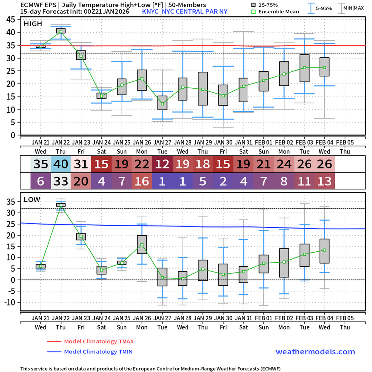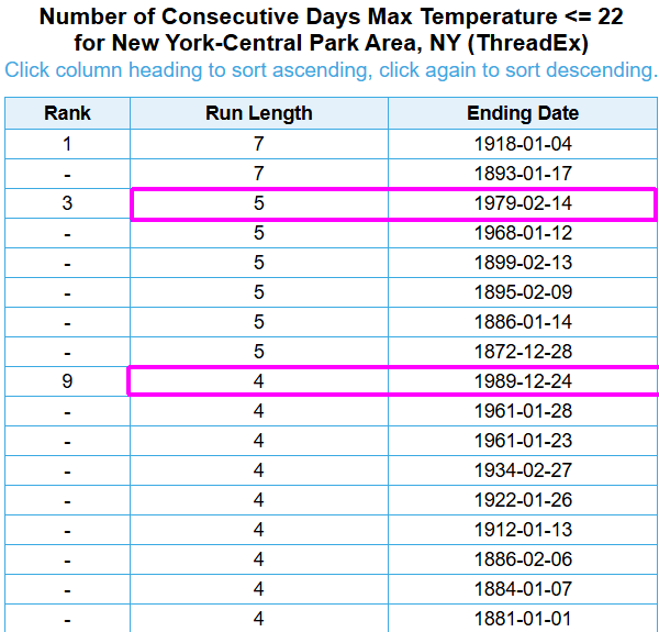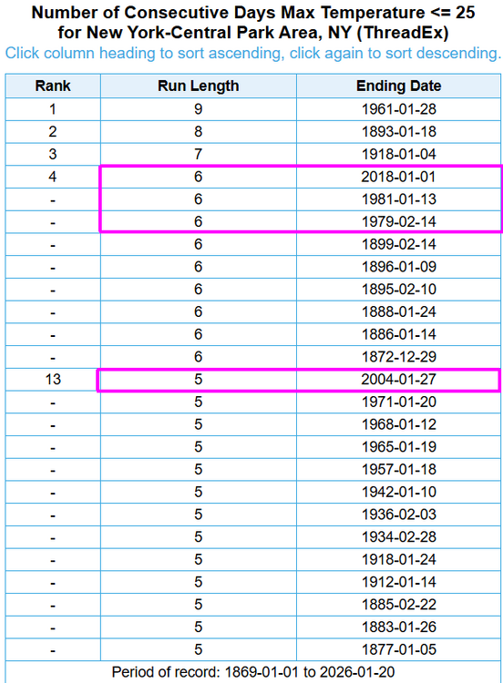 Additionally, we could see several days with highs below 20F behind the Sun-Mon storm at Central Park. Mon's high is highly uncertain - could end up close to 30F if the storm trends further north. Any streak of 5+ days at/below 25F and 4+ days at/below 22F would be quite notable. There have only been four such streaks of <=25F and two such streaks of <=22F at Central Park in the past 50 years!