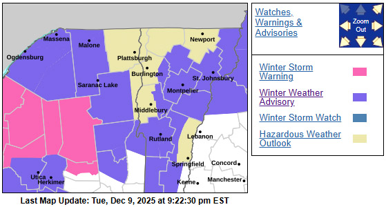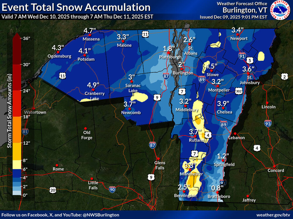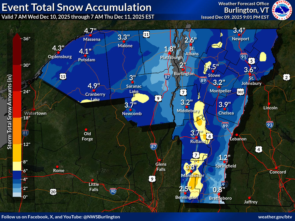 It looks like the Winter Weather Advisories in this area start up at 7:00 A.M. tomorrow, and the forecast here in the valley suggests accumulations in the 3-6” range. That seems to line up well with the BTV NWS Event Total Snow Accumulation map through Thursday morning. The forecast also calls for a few inches of snow beyond that period, which is probably covered in the longer period map that mreaves posted.