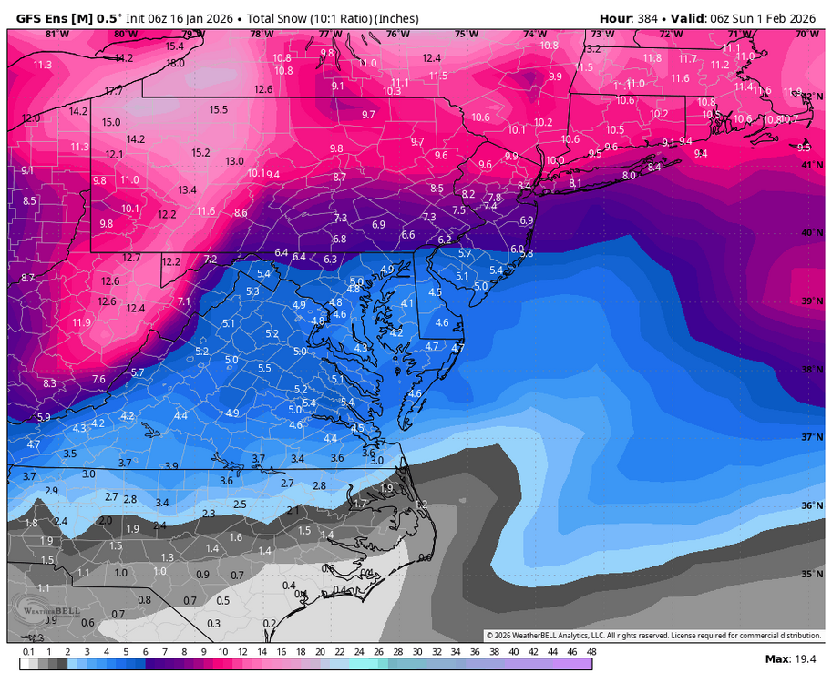 0z Eps and Geps snowfall pattern at 360hrs sure look similar to me. Never saw that before. And no detailed dissection of the snowy 6z Gfs? Lol