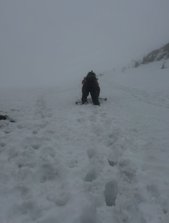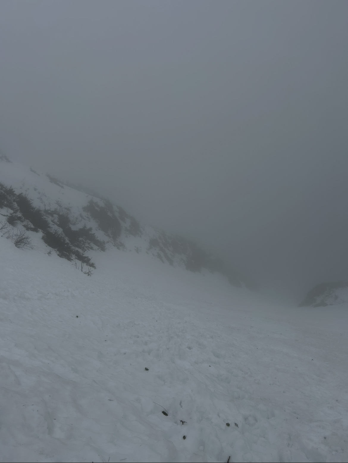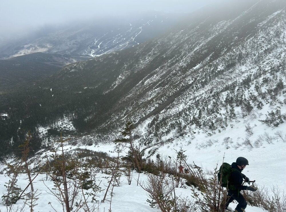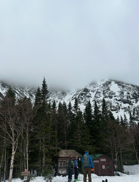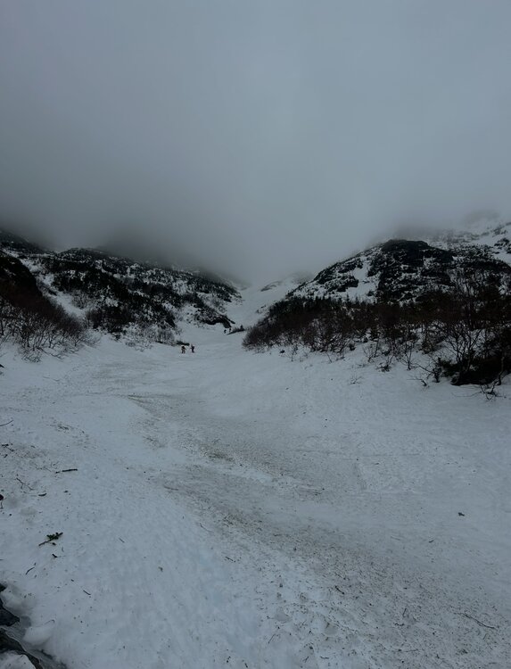 With the Mid-March thaw delivering a hefty blow to the low elevation snowpack across New England, the window for enjoying peak depths in the Presidential alpine was coming to an abrupt end. Ultimately the thaw provided some spectacular spring skiing up high from 3/9 to 3/11, with report after report filtering out of the Presidentials showing cobalt blue skis and little overnight firm ups folding into a superb corn surface across the Gulfs, Ravines and Snowfields. My schedule did not allow me to time up the best conditions, but with a marginal weather window available on Sunday 3/8, I decided to take it despite no guarantee of success. Having already been turned around in the alpine due to avalanche danger in January, I was wary that a second disappointment would be the result. The crux of the day was clear, trying to time the clearing of elevation fog before the snowpack up high froze solid. Saturday night's (3/7) cold front cleared New England of much of the low level moisture that enveloped the region in dense fog for much of Saturday. The lone holdout were the high peaks of the Presidentials, with just enough moisture and orographic forcing to shroud the summits in clouds. Forecasts indicated that gradual clearing of summit fog would occur through midday, perhaps opening up a window for sunshine to peek through. At the same time, colder air was beginning to filter across the higher elevations, threatening to lock the snowpack into ice by the afternoon. Pulling into the Pinkham Notch parking lot at 9:30, I checked the temperature profile across Mount Washington, the summit had quickly plummeted from the upper 30's to 34. Fortunately, temperatures at 4000 feet held firm in the mid 40s. The gradient was tightening but the window to try and steal a descent was still there. Racing up the TRT there was the constant roar of meltwater raging down the Cutler River. By the time I reached Hojos much of the high alpine was still shrouded in fog, much to my dismay. The summit continued to inch closer to freezing, now down to below 33 degrees. It was going to be a one run type of day. Hillman's Highway appeared to be the best option as 2/3 of it's length remained in the clear and only the snowfields above the choke were obscured. Additionally, Hillman's is one of the easier pitches in the zone with plenty of platforms for transitioning. If the freeze came faster than anticipated there would be plenty of options to turn around and descend from. With the clearing trend forecasted, we hoped that perhaps the fog would burn off during the climb. While climbing, it was clear that wishful thinking regarding visibility would not pay off. The cloud deck actually began to lower, now fully obscuring the view once we reached Hillman's right choke. Despite the poor visibility, the snow in the couloir was a pleasant surprise. The lack of a pure refreeze overnight rendered the surface a bit heavy but wind affected enough that it wasn't pure slop. Outside of a few punchy spots the booter was drama free. Approaching the top of the line, some aspects were beginning to harden - we had just beaten the freezing line to the top of Boott Spur. The heavy snow on the descent was a substantial workout, though while shrouded in cloud cover the surface was very workable and pleasant. Once we punched through the overcast about 1/2 down, temperatures spiked quickly and the snow gained a noticible grab to it however the sustained pitch of Hillman's helped negate the sticky snow. The ski down to the car was slow going, the Sherb was melting fast and rocks were everywhere on "coreshot corner". Despite conditions not truly aligning, it was a fantastic day up high on the eastern slopes of the Presidentials! I still jealously watched footage of bluebird skies, huge linkups, and perfect corn snow all over the mountain emerge over subsequent days, but I was thrilled to not view from afar with sour regret. Sometimes you just have to go and make it happen.