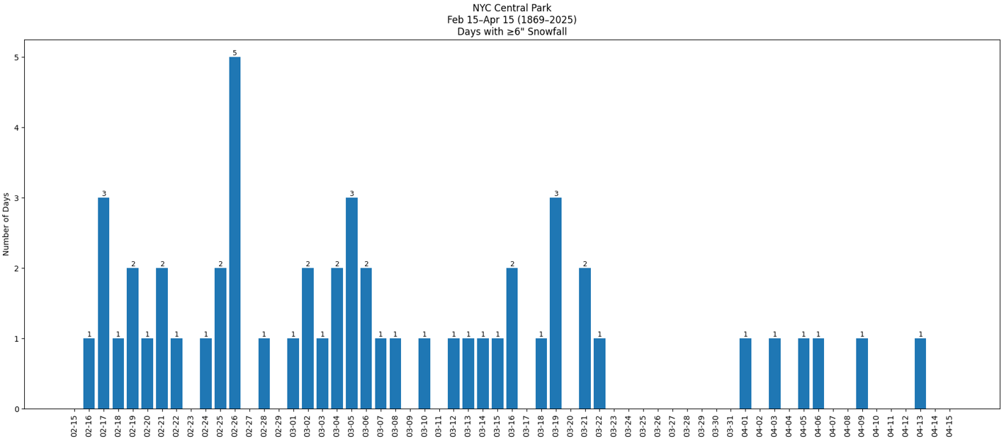 Negativity bias is real. People often assume that their "crystal ball" is clearer at longer lead times when adverse outcomes (e.g., lack of snowfall) are involved. Psychologically, people tend to give greater weight to negative outcomes than positive ones. Those threats appear clearer or more certain, because they generate stronger cognitive or emotional reaction. In reality, the extended range forecasts showing a bleak outcome for snowfall are no more or less likely to verify than those that show a lot of snowfall at similar ranges. Guidance beyond 10 days has a sharp falloff in skill. Having said that, the frequency of days with significant (6" or above) snowfall declines in New York City, especially after mid-March. Moreover, just over one-in-four years (26.8%) saw no measurable snowfall during February 15-28 but only 3.1% of years (1878, 1925, 2002, 2012, 2020) saw no measurable snowfall from February 15 to the end of snow season. At the current lead time, it is premature to assume that Winter 2025-2026 has seen its last measurable snowfall. -
