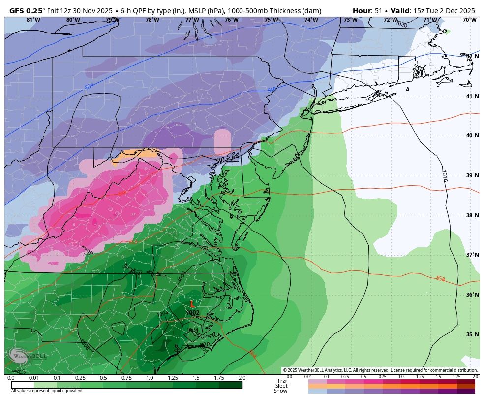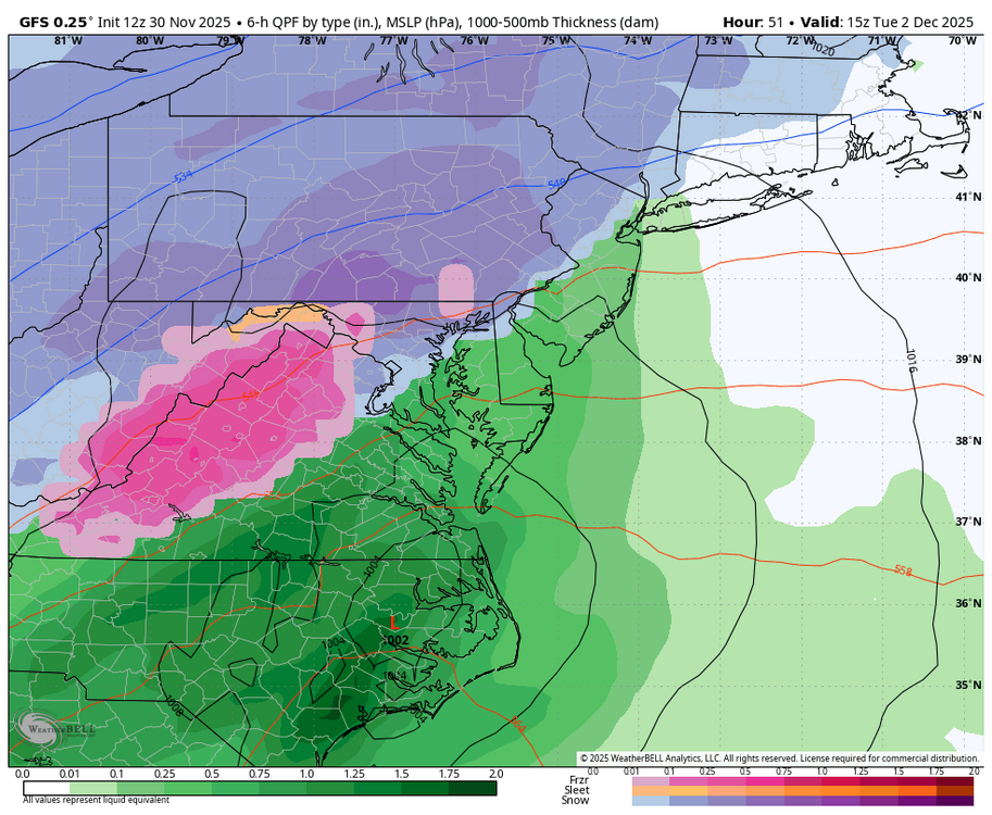 Still quite a difference in precip. amounts. GFS advertising an inch of liquid north of 70 and Euro about .60. There are some things to really like with this system if you north and west of the beltways with some elevation. Maybe a good old fashioned 5-7 that ends in drizzle. Euro 850's and thicknesses and even surface temps look really good. GFS only a bit warmer. I would think any moderate to heavy precip is all snow.