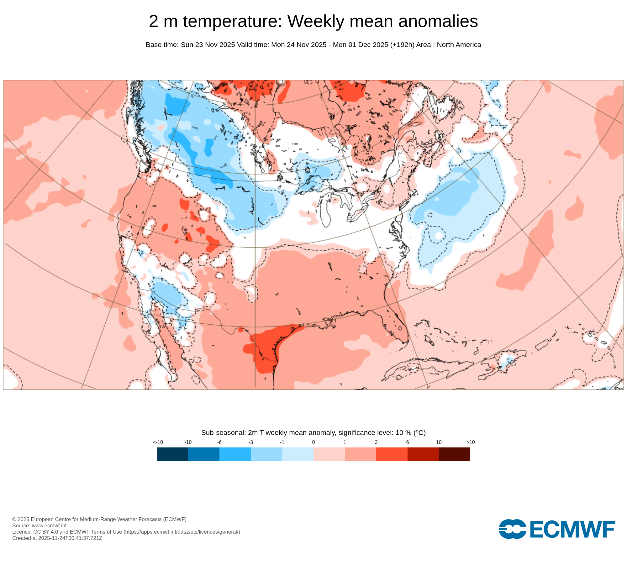 The most anomalously cold air in the entire northern hemisphere will reside in Canada, allowing the northern tier of the Eastern US to stay somewhat cool despite the -PNA.
