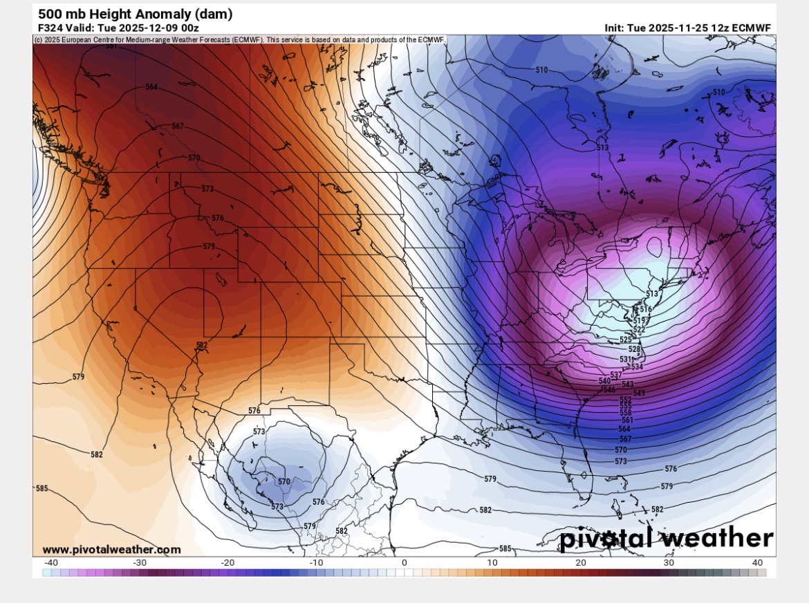 Amazingly, the 12z Euro has a very similar solution to the 12z GFS. And the 12z Euro absolutely hammers the area with cold throughout its 360 hour run. I think it is safe to say that modeling is "seeing" the MJO rotation now through cold phases. I am just going to have to file this one away for safe keeping. I bet if I go back through the threads, I can find a similar scenario where the MJO wasn't recognized until the "last moment." Usually, modeling(as noted the other day) will try to sustain cold while in the warm phases of the MJO. Then, at the last minute, models flip warm. I think we have seen this one, except in reverse. Now, I do think we see some warm-ups. These are deep troughs and steep ridges. That is going to move a lot of cold air and warm air into places which don't see things like that often. There is a mechanism to transport subtropical air to the Arctic Circle and a mechanism to transport Arctic air into the subtropics. During La Nina, especially early in the season before long range patterns flatten into more stable waves for winter, these wild patterns are possible. I would suspect that we see this wild pattern persist through much of December. I would definitely think an anafront is on the table. We have seen several of those recently, and the cold that is present on modeling would certainly allow for one. -