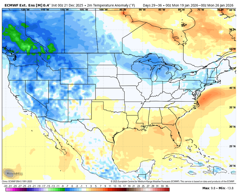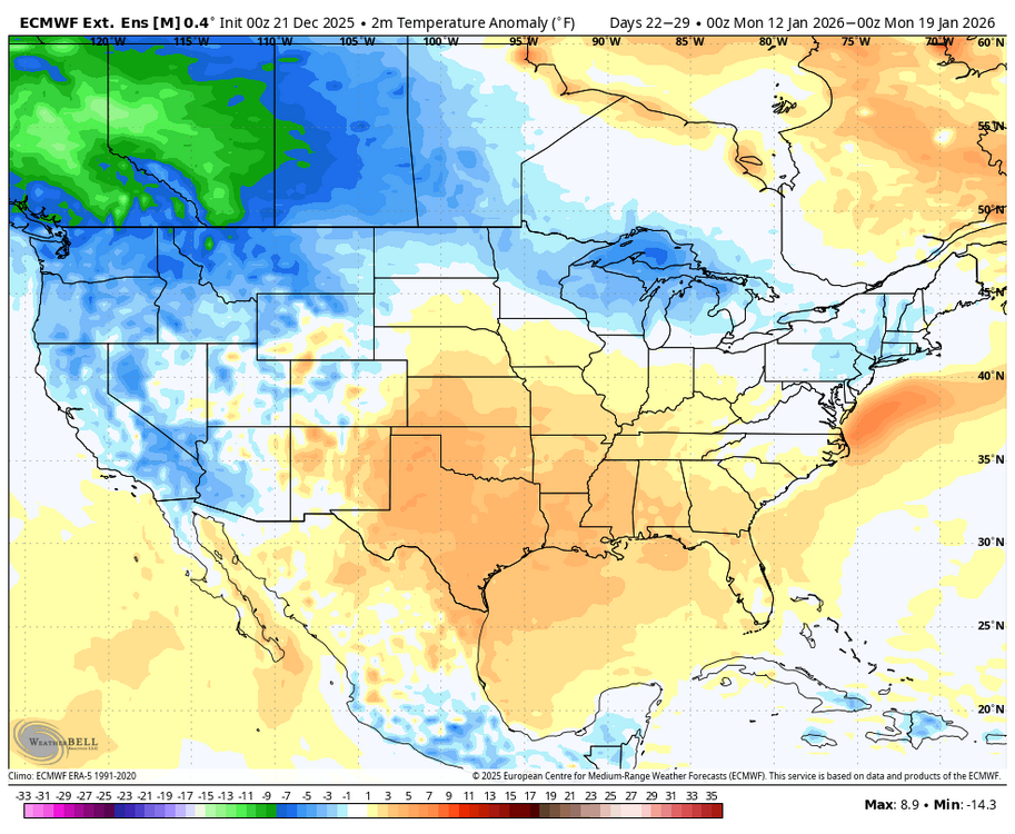 I continue to have a concern about certain WxBell maps being off. I’ve discussed the CFS being wacky and mainly too cold a number of times to @donsutherland1. But I also can’t figure out why their Euro Weekly (EW) maps are always colder than the ECMWF’s own EW maps! To me it just tells me that the WB EW maps are significantly too cold, period, which remains a concern. Why are they too cold? Here’s examples from today’s EWs: 1. For Jan 12-18th: ECMWF: AN ~80%, BN ~2% of US WxBell: why do they have… - AN in only ~1/3 of US vs 80% on in-house? - BN ~25% of US vs only 2% on in-house? ————- 2. For Jan 19th-25th: ECMWF: AN ~50%, BN ~ 3% of US WxBell: why do they have… - AN in only ~10% of US vs 50% on in-house? - BN ~50% of US vs only 3% on in-house?
