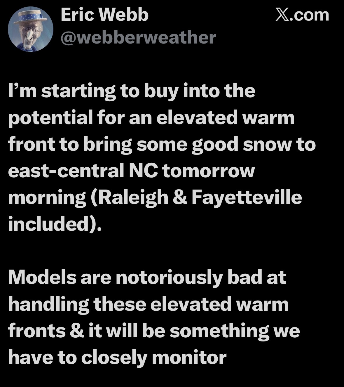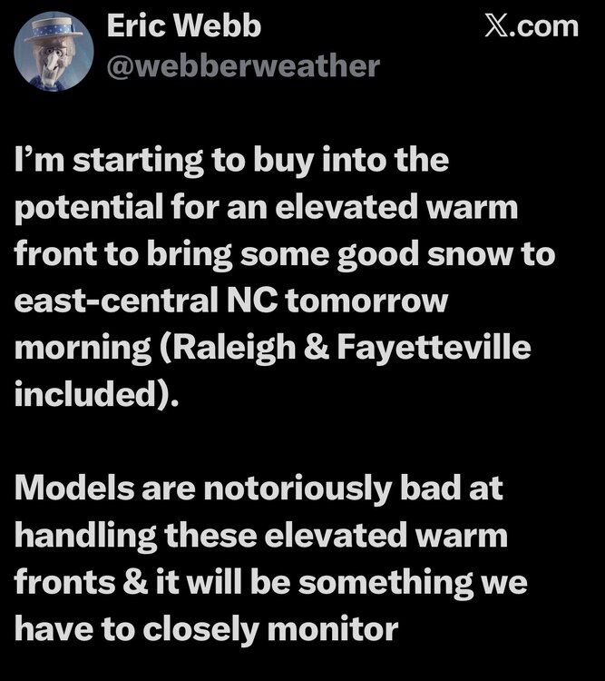1st & Final Call (Parenthesis is potential; Bigger gap means higher boom/bust potential) Favored Models: Blend of EUROAI & RRFS (Experimental model that will replace NAM this spring) AVL: 3-6 (High:8/Low:2) CLT: 4-8 (High:10/Low:3) FAY: 6-10 (High:12/Low:4) GSO: 3-6 (High:8/Low:2) GSP: 3-6 (High:8/Low:2) GVL: 10-15 (High:20/Low:5) (Likely area to be sweet spot given model trends of last 48 hours. Will get longest duration of coastal banding due to strengthening/consolidating SLP and 850 low) HKY: 3-6 (High:10/Low:3) (Foothills away from the escarpment will have some additional forcing due to upslope. Also lee trough/frontogenesis forcing due to thermal gradient) ILM: 4-8 (High:12/Low:4) RDU: 4-8 (High:12/Low:1) (Area of higher boom/bust potential due to dry air infiltration from parent HP and coastal energy transfer. The Triangle will also be close to the edge of the coastal death band. Bust potential is likely being overdone but I am putting it in as models have shown it) VAB: 4-8 (High:12/Low:2) -