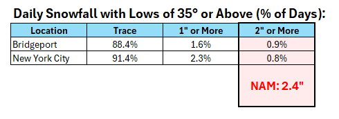 The combination of the warmth (the daily low temperature wound up at 35° in NYC), light precipitation rates, and warming at the mid-levels all suggested that the 2"+ NAM amount was unrealistic for the City. At that time, the forecast low was 33°-34°, but the NAM idea was unrealistic. With lows of 35° or above, a trace was by far the most likely outcome. The same would hold elsewhere in the NYC region at such an elevated low temperature. For example, below are the historical statistics for Bridgeport (1948-present) and New York City (1869-present): And here was the NAM map: