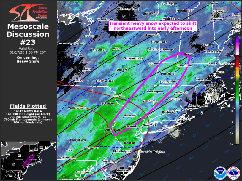 Mesoscale Discussion 0023 NWS Storm Prediction Center Norman OK 0855 AM CST Sat Jan 17 2026 Areas affected...northern NJ into southwest New England Concerning...Heavy snow Valid 171455Z - 171800Z SUMMARY...Transient heavy snow is expected to shift northeastward in the Northeast to southwest New England through early afternoon. Rates should briefly reach 1 inch per hour before waning. DISCUSSION...A confined band of moderate to heavy snow with several half to quarter-mile visibilities ongoing across mainly southeast PA, north-northwest of the Philadelphia Metro Area, in association with a shortwave impulse progressing northeastward across the Northeast. 12Z observed and forecast soundings indicate the dendritic growth zone is centered between 575-650 mb. Ascent within and below this level appears likely to peak through about 18Z, which should favor snowfall rates around 1 in/hr. This should be transient at any one location as the burst of heavy snow shifts northeastward followed by drying in the dendritic growth layer. ..Grams.. 01/17/2026 ...Please see www.spc.noaa.gov for graphic product... ATTN...WFO...GYX...BOX...OKX...ALY...PHI...BGM... LAT...LON 40787433 40517507 40807529 41777433 42797315 43027244 42917200 42527218 42057256 41367348 40787433