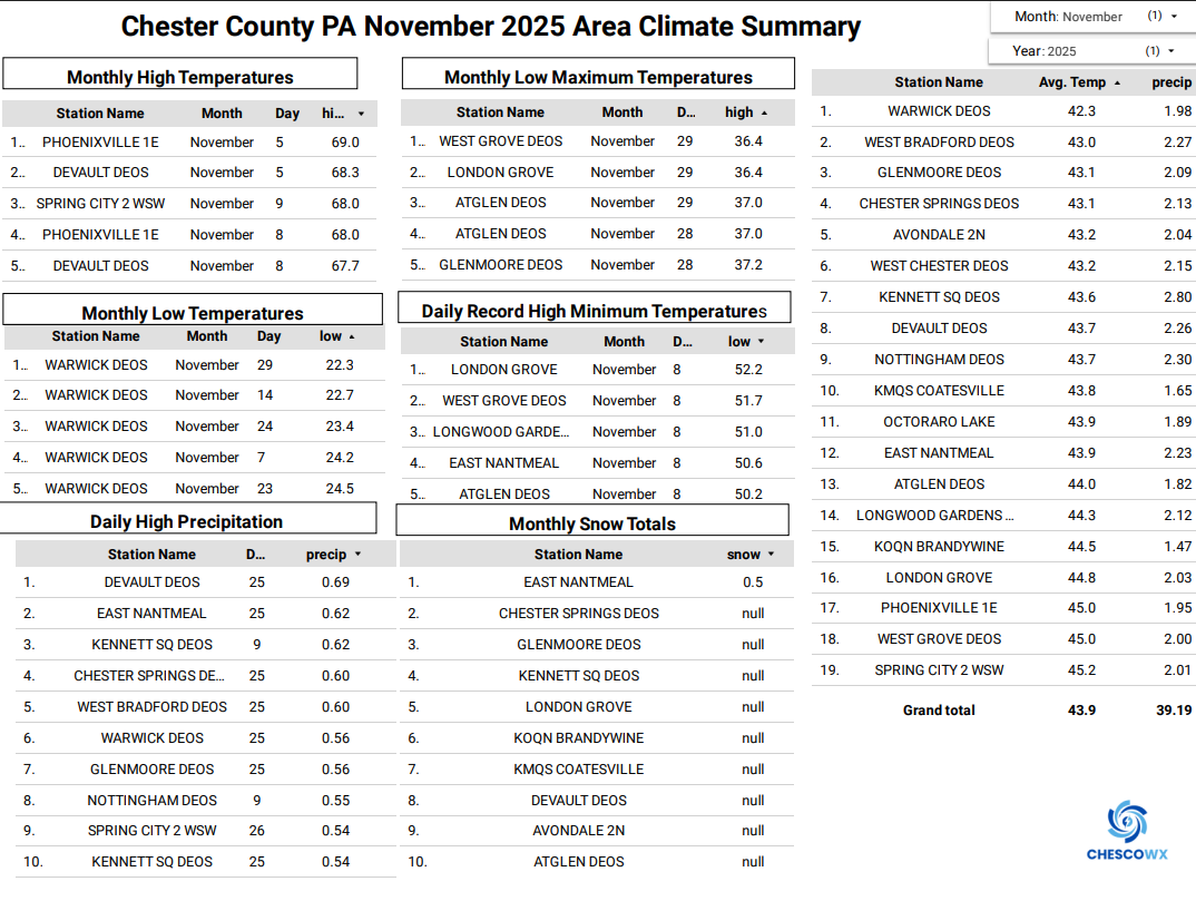 8. Below is the November Climate Summary for Chester County PA. With our average temperature of 43.8 degrees, we were just a little below Average 44.0. As you would suspect this was the 67th chilliest November out of 133 years. Our coldest November on record was the 37.5-degree average back in 1977. The warmest November on record was way back in 1931 at 50.8 degrees. We averaged across the area 2.06" of rain which is about 1.30" below normal. Our wettest November was in 2018 when we averaged 8.22" of rain. Snowfall was 0.5" with is 0.5" below normal for the month. Our snowiest on average November was back in 1938 when we averaged 10" of snow.