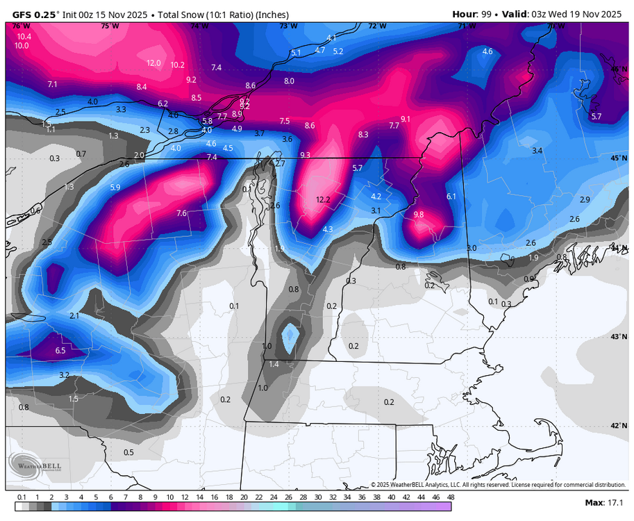 Regardless of the maps, the signal is there for the 1500ft+ elevations from Stowe to Jay to get appreciable snow following the messy/rain before that. Also that same elevation at Bretton Woods in Alex’s zone looks just as good. Moist W/NW flow behind the Saturday night system looks to be productive from Sunday PM to Tuesday AM. -