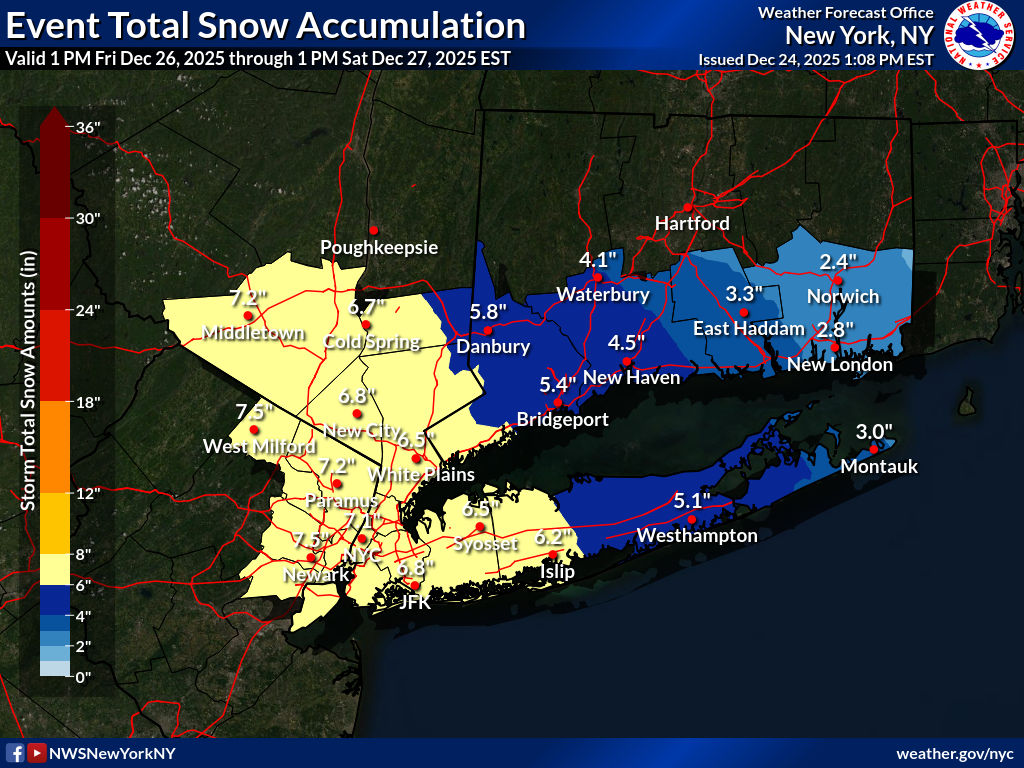 RGENT - WINTER WEATHER MESSAGE National Weather Service New York NY 107 PM EST Wed Dec 24 2025 CTZ005-009-NJZ002-004-006-103>108-NYZ067>075-078-080-176>179-250215- /O.NEW.KOKX.WS.A.0004.251226T2100Z-251227T1800Z/ Northern Fairfield-Southern Fairfield-Western Passaic-Eastern Passaic-Hudson-Western Bergen-Eastern Bergen-Western Essex- Eastern Essex-Western Union-Eastern Union-Orange-Putnam-Rockland- Northern Westchester-Southern Westchester-New York (Manhattan)- Bronx-Richmond (Staten Island)-Kings (Brooklyn)-Northwest Suffolk- Southwest Suffolk-Northern Queens-Northern Nassau-Southern Queens- Southern Nassau- 107 PM EST Wed Dec 24 2025 ...WINTER STORM WATCH IN EFFECT FROM FRIDAY AFTERNOON THROUGH SATURDAY AFTERNOON... * WHAT...Heavy snow possible. Total snow accumulations between 4 and 8 inches possible. * WHERE...Portions of southern Connecticut, northeast New Jersey, and southeast New York. * WHEN...From Friday afternoon through Saturday afternoon. * IMPACTS...Plan on slippery road conditions. The hazardous conditions may impact the Friday evening commute. PRECAUTIONARY/PREPAREDNESS ACTIONS... Monitor the latest forecasts for updates on this situation. && $$ For more information from the National Weather Service visit https://weather.gov/nyc