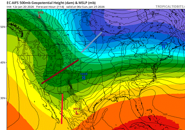The 12z ECM-AI clearly has more wave interference than 6z. Slower ULL ejection and worse phasing. It's not as favorable a solution as last run, which was very good. -