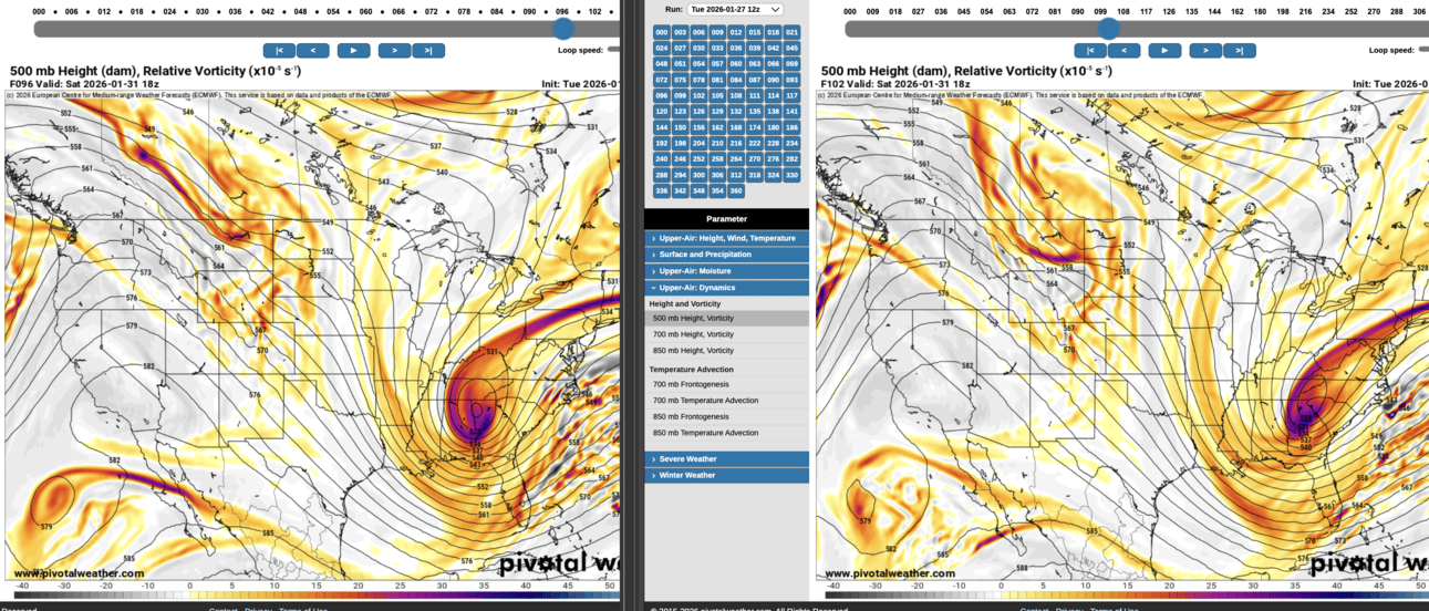 euro 18z left, 12z right. 500/vort valid sat 18z. looks much better on the left, which is why we saw the surface improvemnt
