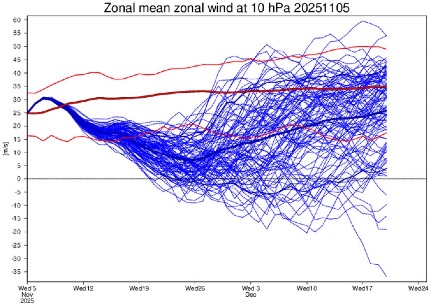 Wow! By a good margin today’s run has the weakest SPV and highest % of members with a major very early season SSW in late Nov or early Dec: Before this, the weakest SPV was on the run from 2 days ago:
