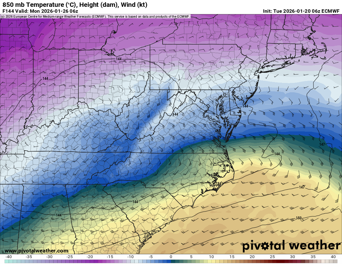 FYI weenie alert for weenies - pivotal weather offers a one week free trial of their geographically zoomed, detailed maps (and access to 06z and 18z euro detail maps). I just signed up. Best week of the year to do that lol, but it does require a credit card. Something I'll be watching over the next 48-72 hours... 850mb and 700mb temperature and wind direction, if and when the low transfers. This image is from the 06z euro, the low is popping off the NC coast. Can the cold press win? If we're gonna get the juice, we may flirt with the heat.
