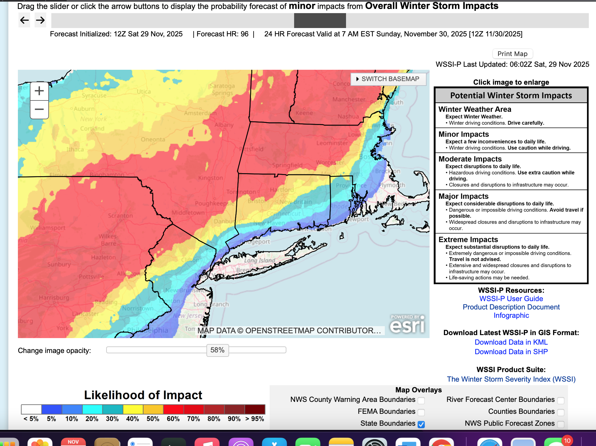 This thread headline looks good based on casual look at info through 06z/29. NYC CP might see their first measurable snow-sleet. Back later today. Ensemble WSSI-P graphic -06z/29, and ensemble prob for 3+" of snow (legend color code probs) hopefully speak for themselves.