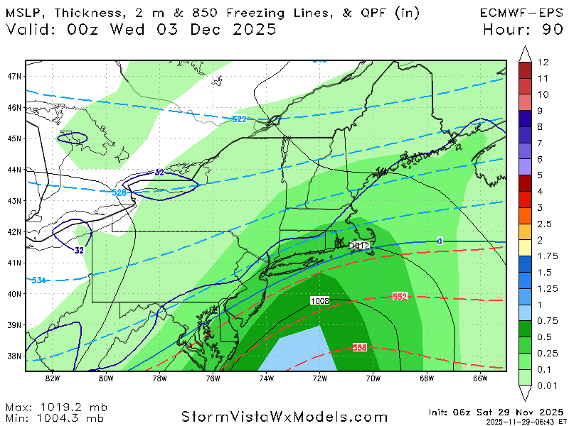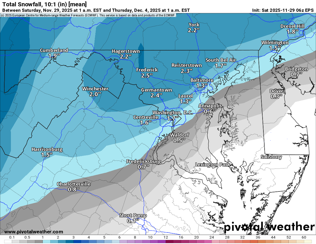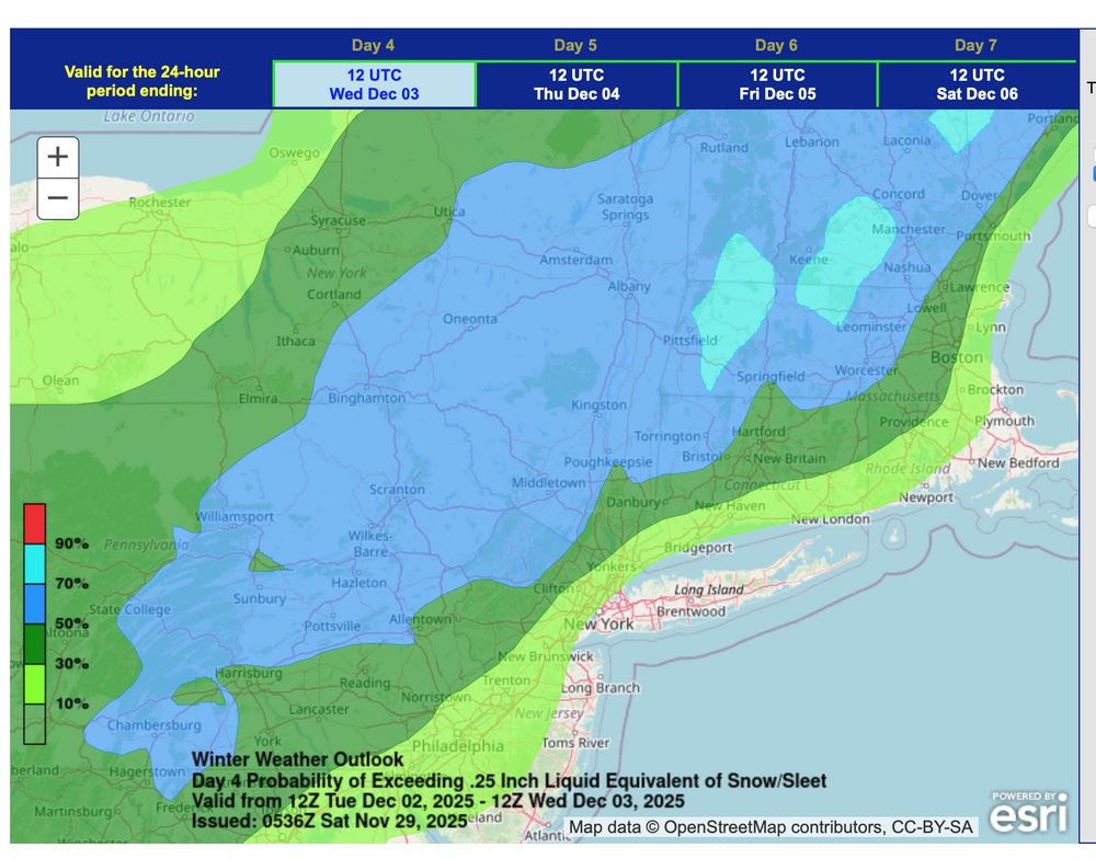 LONG TERM /MONDAY NIGHT THROUGH FRIDAY/... Unsettled weather will continue into the first week of December as cold air in the middle of the country sets up a strong baroclinic zone over the eastern US. High pressure in the Plains should keep cold air in place on the northern side of the precipitation shield from a wave of low pressure progged to move out of the Gulf. This system should move northeast around the base of the aforementioned high pressure system, bringing increasing moisture to the Mid-Atlantic Tuesday into Wednesday. The system at this time looks to be somewhat progressive with the lack of a strong area of high pressure to slow the advance of the system. Despite the expected fast forward movement, a deepening coastal low could still provide enough forcing juxtaposed with favorable upper jet dynamics to produce significant snowfall across the region. Snow looks to arrive later Monday night and lift across the region during the day on Monday. The eventual track and intensity of the low will have big implications on observed snowfall totals and the northward extent of any mix/rain scenarios. The latest WPC probabilities of 0.25" or greater liquid equivalent snow/sleet paint medium probabilities (40-70%) across most of the region, with slightly lower amounts expected in northwest PA. The latest Winter Storm Outlook highlights a 30-50% chance of Warning criteria snowfall (5"+) in northeast PA. GEFS and ECENS probabilities of 6"+ continue to outline probabilities <30% with a higher likelihood in northeast PA up through coastal New England. If confidence increases in higher amounts, Watches may be needed in the next 24-48 hours. At this time, though, a plowable snowfall seems like a reasonable bet for most of the region. Continue to monitor the forecast in the days ahead, especially if you have plans to travel. -