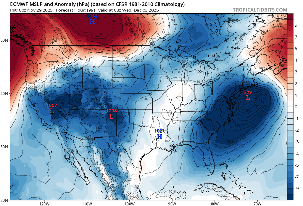 Looks like a split decision showing up for the first week of December. Long range models shifted colder with the trough into the East instead of the ridge from previous runs. But the large storm on the 2nd and 3rd shifted warmer with a further north track. Main issue with the storm is the very fast flow and lack of blocking allowed the high over New England to move off the coast. So the further north storm and slightly stronger WAR on the day of the storm pushed the rain to snow gradient just to the north and west of NYC. Since the colder start to December is a new pattern not showing up until day 6-10, it’s uncertain how the current day 11-15 will actually play out. If you look back on our recent Decembers, they have a tendency to start out cold from the 1st through 15th. Then we get the warm up every year since 2011 between the 17th and 25th. So it will be interesting to see how things actually play out vs what the models are currently showing. We would want to eventually see a colder storm for our area while we still have the cold. This is very important during La Nina’s since we need to get over 4” of snow in December to match the above vs below seasonal snowfall that I outlined a few days back in this thread. So hopefully we can connect with at least one storm next few weeks while the colder start is still nearby. New early December pattern colder than old runs Old run too warm for early December New run warmer storm further north on the 2nd and 3rd Old run storm track colder to the south and more suppressed