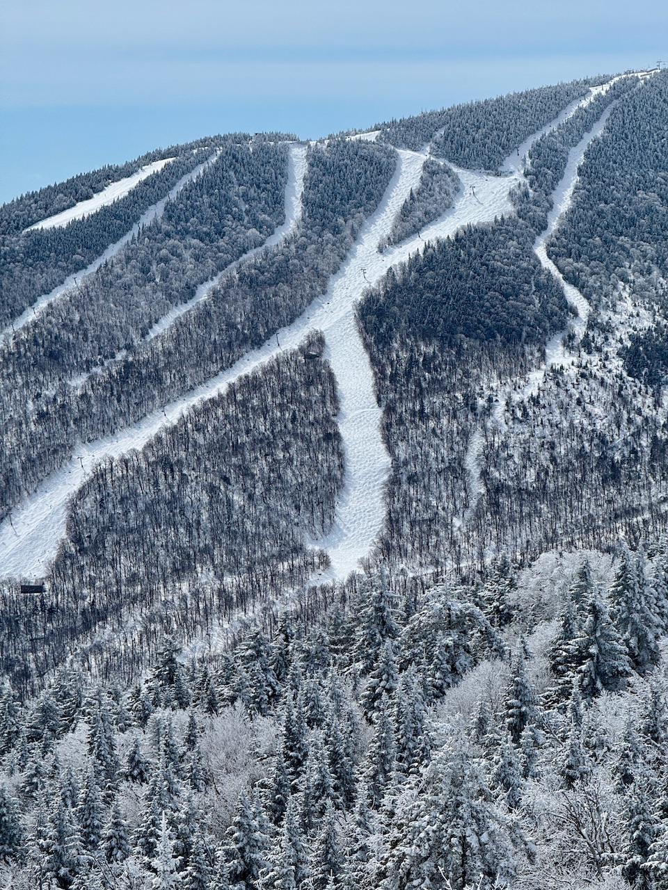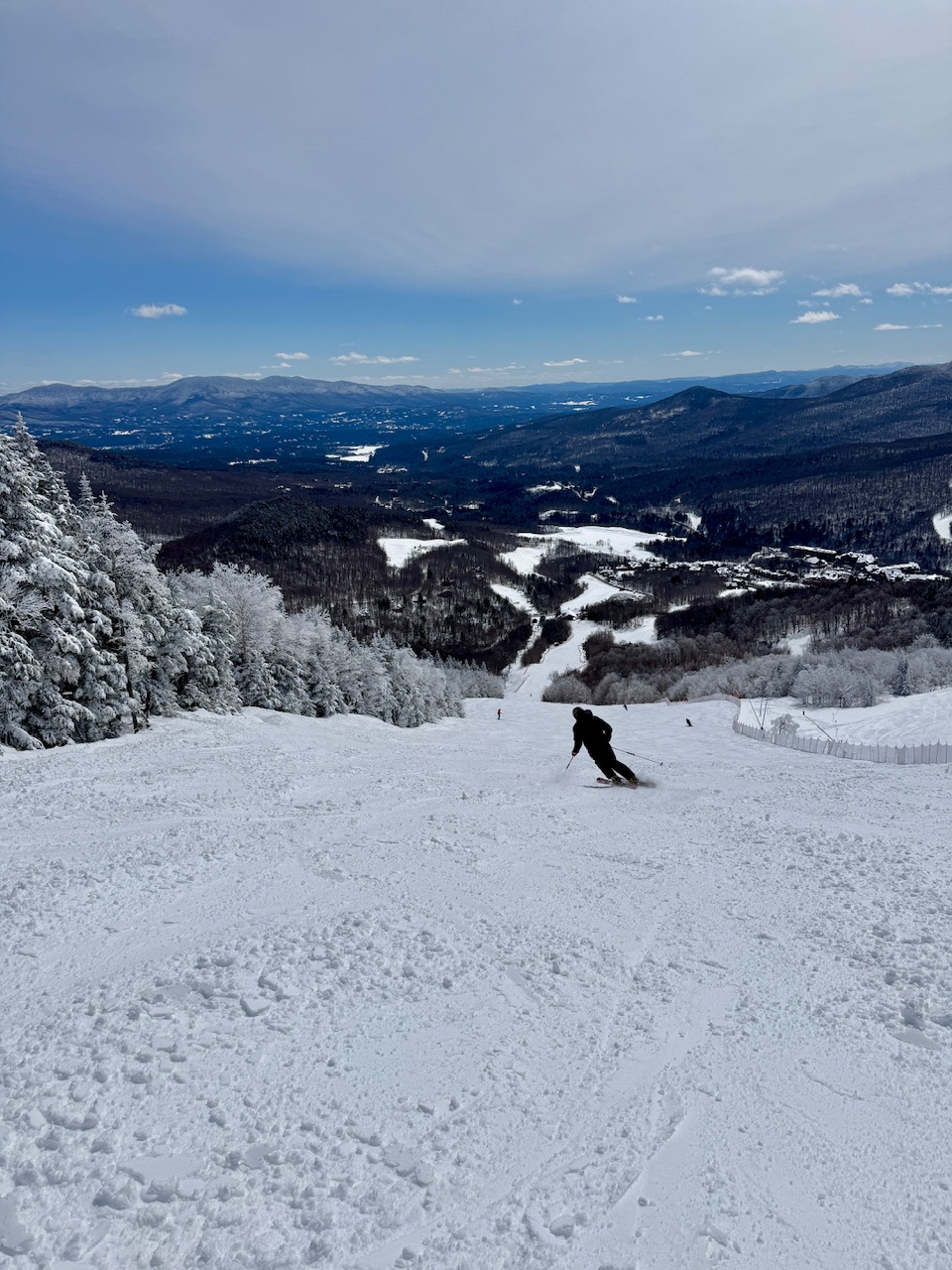 When I left the mountain around midday yesterday, it was a bit tough to pull myself away because the ski conditions were really good both on and off piste. The Vista Peak terrain was skiing on 10-12” of dense powder that provided a solid resurfacing of even steep pitches, and all the way down to 1,500’ at the Timberline Base there was at least 9-10” of that snow with a lot of liquid equivalent in it. The precipitation at that point was snow that was a mixture of both regular flakes and more granular types, and it frequently switched back and forth favoring one over the other. As the day wore on and moved into the evening, precipitation at our place in the valley gradually transitioned to more mixed precipitation, but I wasn’t sure what had gone on up at Bolton Valley – it was possible that the mixed precipitation was minor, leaving just a skim atop the new snow, or it might have been a lot more substantial. I decided to head up for some turns today to find out where conditions stood, and without the Vista Quad, the Timberline Quad, or the Wilderness Chair in operation, I decided to do some touring. I had though about hitting the Nordic and Backcountry Network, but I decided that touring via the Wilderness Uphill Route was a better option – if the off piste and ungroomed snow was in bad shape I could catch a run down some groomed terrain instead. Well, I’m glad I gave myself the option of a groomed descent, because anything terrain had not been groomed was essentially unskiable. The combination of dense snow granules, sleet, freezing drizzle, rime, and whatever else had fallen, hadn’t left just a thin crust atop the snowpack, it was a substantial crust. I checked in various spots on my tour, and the crust was typically about a half inch thick, with probably close to a half inch of liquid equivalent in it. Thankfully, the groomed terrain was in excellent shape, since once that crust was pulverized into the rest of the new snow, it made a substantial covering of the old snowpack. I descended on groomed terrain via the Wilderness Liftline and Lower Fanny Hill, and that was really nice. In terms of the off piste skiing, it’s not going to be good again unless you hit an area that has been broken up by previous skiers. The snow below the crust is excellent, but you’ve got to break up the crust to get to it. Other than that, it will need to either need to warm up or we’ll have to get another resurfacing storm cycle before it will be fun to get back off piste again. Until that point, at least the groomed slopes are in great shape because of the resurfacing we’ve gone through. In the valley I’ve recorded 1.05” of new liquid equivalent in the snows from the past couple of systems, so the mountains must be up there around 1.5” of liquid or even more. As a testament to that, the snow depth at the Mt. Mansfield Stake has jumped a foot over the course of the past few days, so these recent March storms have been an excellent addition to the snowpack as we head toward spring.