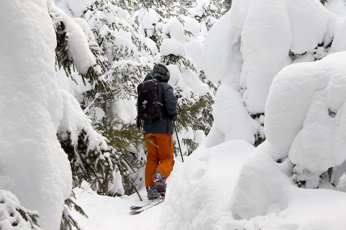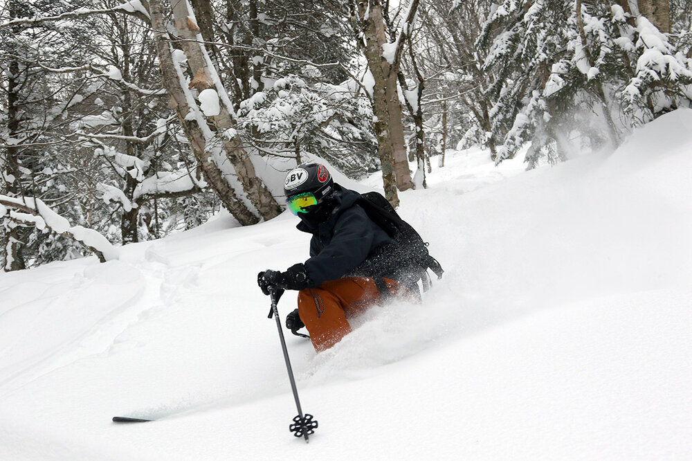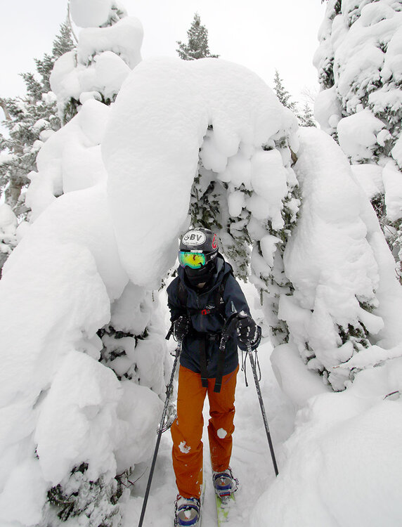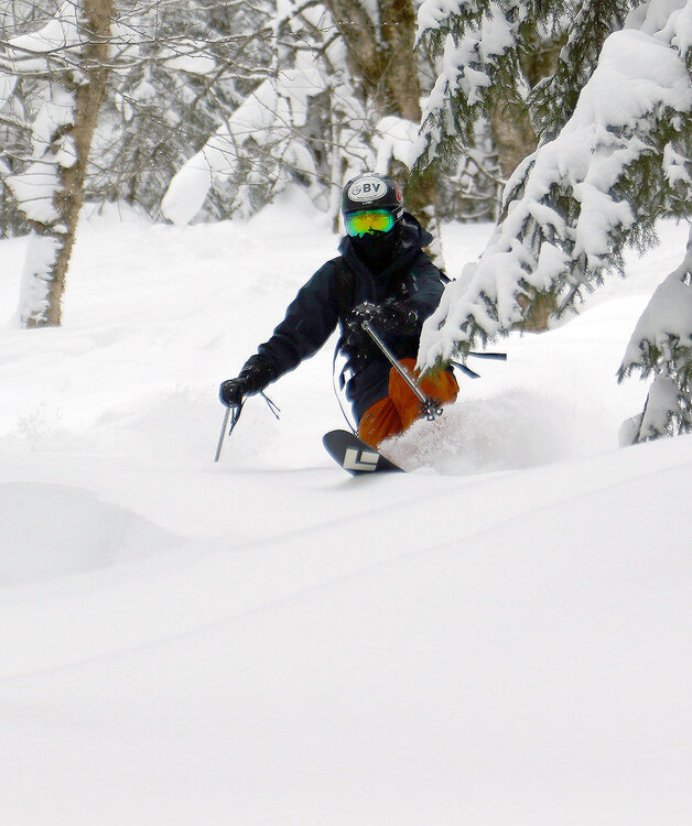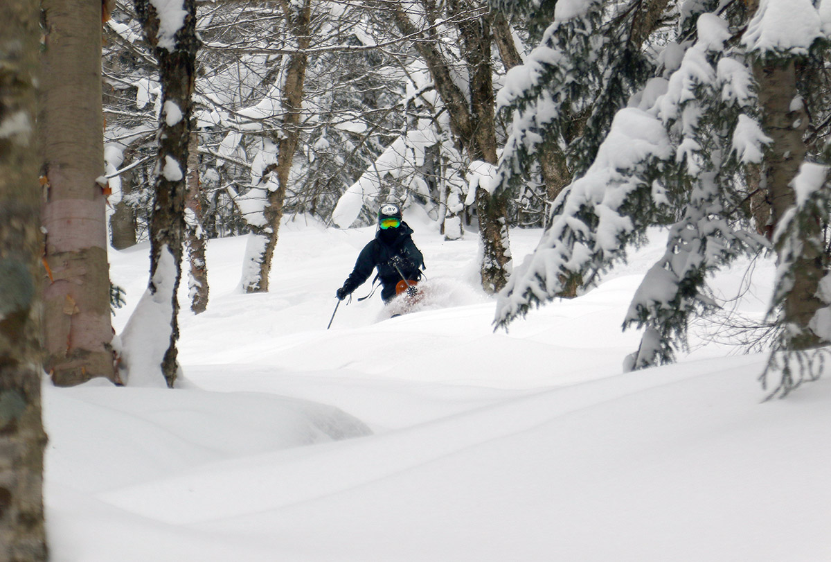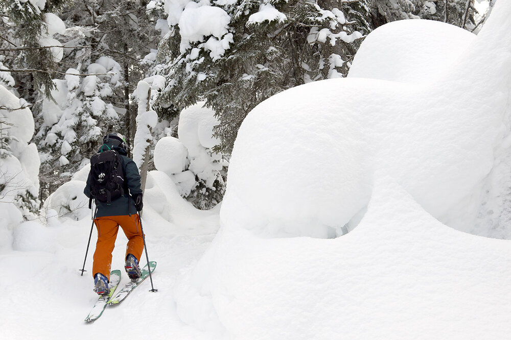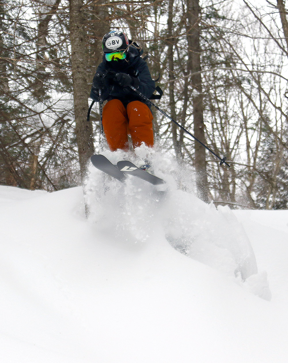 Friday’s storm provided a healthy shot of snow and liquid equivalent to the snowpack, but Saturday was fairly busy at Bolton Valley and by the end of the day a lot of terrain was tracked and packed. That got me thinking about another sidecountry day, so yesterday my older son and I headed up to the resort with that in mind. Last Sunday we spent much of our time in the sidecountry terrain on the north side of the resort, so yesterday I decided to introduce my son to some of the sidecountry terrain on the south side of the resort. One way to access the drainage to the south of Timberline below Goose Pond is to park at the Timberline Base, ride the lifts to the top of Vista Peak, and then traverse out on the Woodward Mountain Trail and drop in. We brought skins and backcountry gear to give us the freedom to do some extra exploring out toward Woodward Mountain, but if you know the terrain and are conservative with your traversing, you can also treat it as standard sidecountry on your downhill gear. The quality of the powder was very similar to what we experienced on Saturday – a lot of the recent storm had snow that fell in the 6 to 7% H2O range, but there were a few inches in the 10-11% H2O range at the end that gave it some medium density. Overall, the powder was surfy and dry, and deep – it’s very bottomless out there in the backcountry, and fat skis and powder baskets are a huge help getting around, whether you’re skiing or simply traversing. With the high elevation snowpack depth at around 7 feet in the Northern Greens, if your ski pole doesn’t gain any purchase and punches through some of the thicker layers in the pack, it will simply disappear into the void until your arm stops it. Another sign of the deep snowpack at the tall, multi-foot snow pillows that surround you in areas protected from the wind; they really give you a sense for how much the snowpack has been building over the past few weeks. The only knock I can make against the quality of the powder right now is in areas below roughly 2,000’ on southerly aspects. There’s been enough warming there to add a melt crust to the surface and degrade the powder. That’s the downside of skiing on the north side of that Goose Pond drainage as one gets farther into the spring. One way to avoid that is to ski on the other side of the drainage below Bone Mountain, but access and return to the resort from that side of the valley is much less convenient and requires more of a backcountry commitment. Thankfully all the powder at the head of the valley where there are a lot of great ski lines is in excellent shape Although the south side of the resort certainly doesn’t have the level of backcountry skier traffic that the north side does, we did encounter some backcountry activity out there. On our return traverse using one of the VAST trails, we came upon a group of combined snowmobiles and snow bikes cruising along in the deep snow, and they looked like they were having a blast. The 4x4 Center Driving School at the Timberline Base isn’t in operation this winter, so Bolton Valley is using their upper lot for additional parking, and that makes and excellent spot for returning from the VAST trails and back to the resort.
