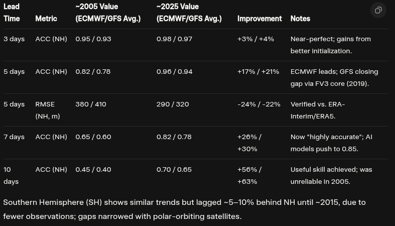 Anomaly Correlation Coefficient (ACC) has increased by about 20% over the last 20 years for 5 day lead times and nearly 30% for 7 day lead times. It has increased about 60% for 7 day leads!! Root Mean Square Error (RMSE) is down by 23% at 5 day leads. These numbers are all from the GFS and ECMWF.