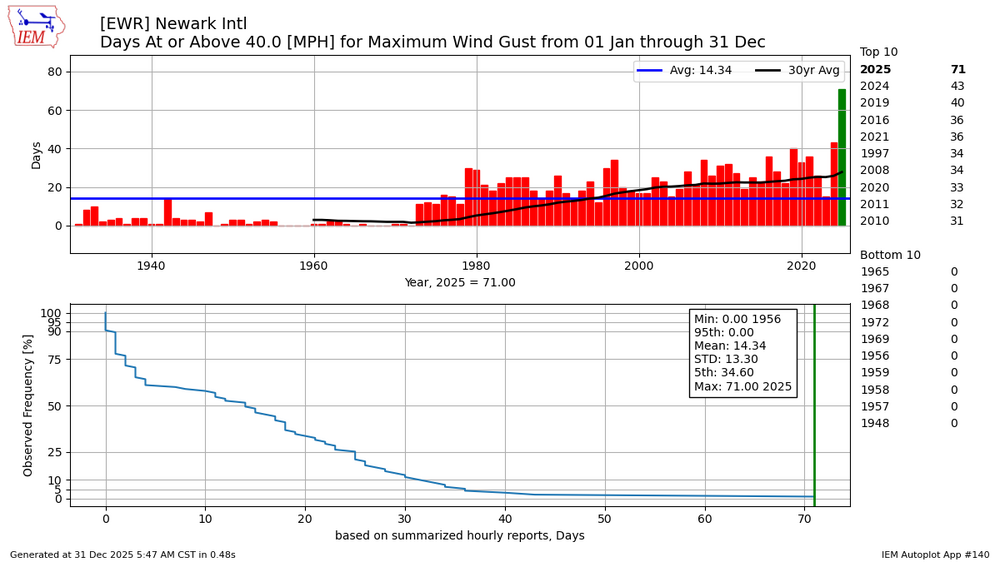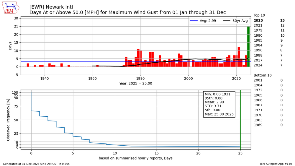 The really big story this year has been the record breaking number of days by a wide margin with wind gusts exceeding 40 and 50 mph across the area. This is the result of an unusually active storm track through the Great Lakes and to the west of the I-95 corridor. Nearly all the days with these stronger gusts had a west to northwest flow. The lack of coastal systems this year really stood out as there was only a small number of days with 40 or 50 mph gusts from a southeast to northeast direction. So a continuation of the very dominant northern stream of the Pacific Jet pattern. At least December allowed our region to get two 4-8” clipper systems for the first time during the month. But since these were northern stream storm systems, we couldn’t get into a coastal KU benchmark track. Plus the Great Lakes cutter pattern remained active so we had two warm ups with rain and fog shortly after the two snowstorms. These clippers narrowly focused the snowfall to such an extent, that it’s the first time since the 1980s and 1950s in December that the heavier 10”+ snows focused around NYC Metro. Which didn’t allow Philly and or Boston to share in the heavier 10”+snows.