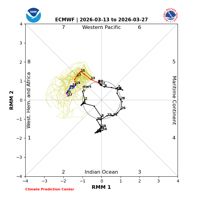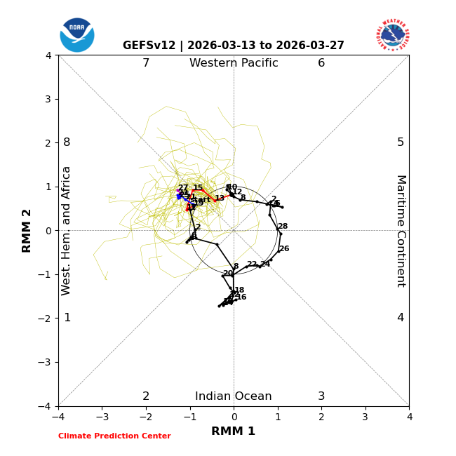 Latest MJO: all forecasted days are in phases 7 and 8, the coldest post Niña winter March phases on avg per records: