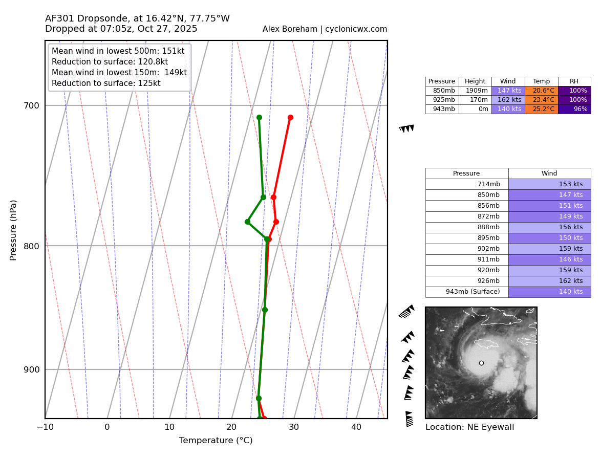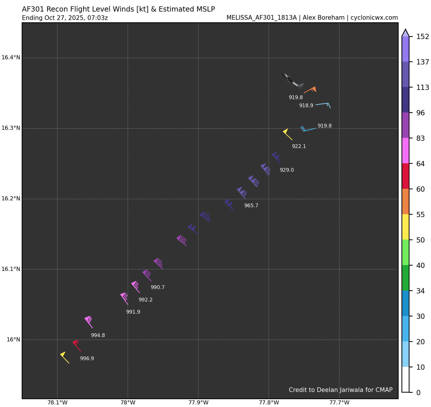 Recon Hunters are currently inside Melissa. Those previous readings were measured in the south quadrant. In Atlantic hurricanes, the south quad typically features weaker winds and higher pressure. The higher winds and lowest pressure (peak intensity) reside in the northeast quadrant. So process that for a minute. The weaker quadrant of the hurricane measured at 923mb with 150mph winds. What do you think they will find in the northeast quadrant?