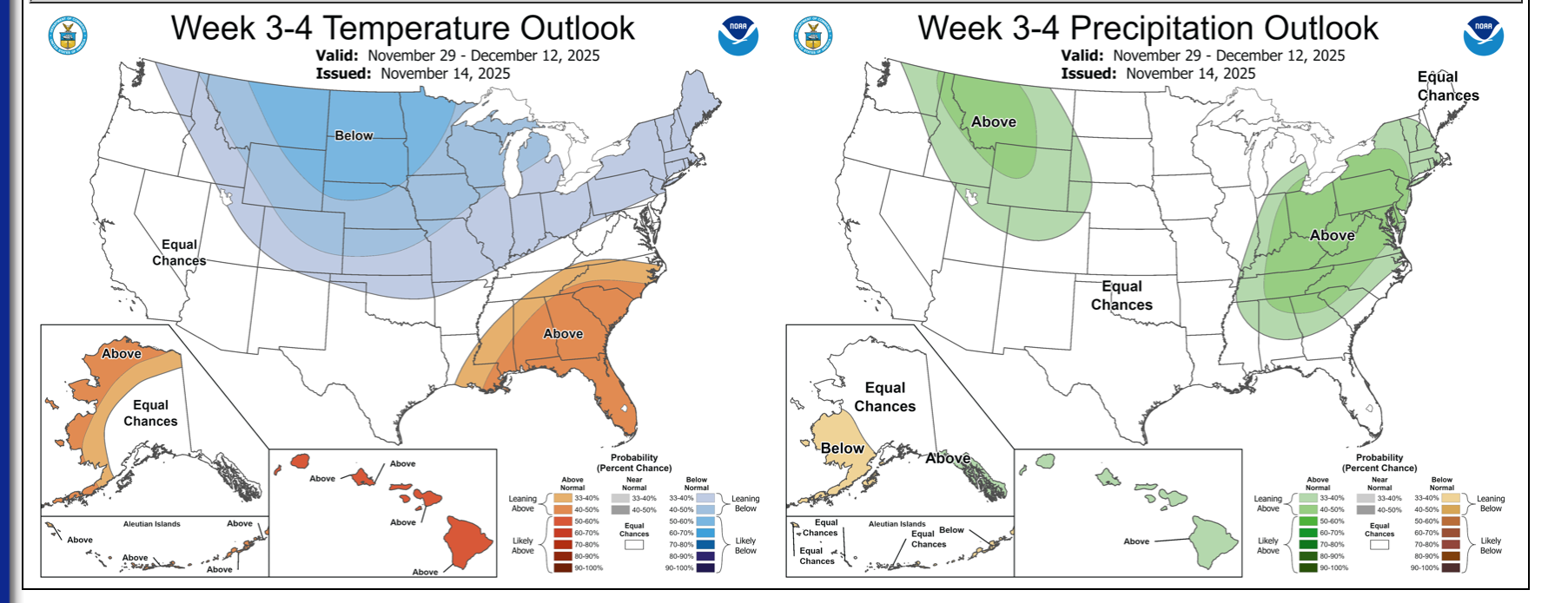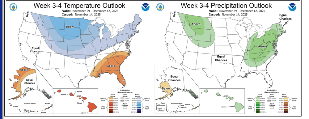 40 / 24 off a low of 33. The next few weeks looks like a swing 11/17 - 11/29 : Overall warmer than normal ridging into the east - mainly dry, a few days much above normal 11/20-21 , 11/26-29 period 11/30 - beyond: change turning much colder - trough into the east - colder nationwide - first storms/snow of the season