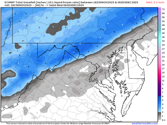 URGENT - WINTER WEATHER MESSAGE National Weather Service Baltimore MD/Washington DC 1238 AM EST Mon Dec 1 2025 ...FIRST WIDESPREAD WINTER EVENT OF THE SEASON... .Precipitation is expected to overspread the area after midnight tonight from southwest to northeast. While precipitation is likely to start as snow areawide, it is expected to mix with and change to sleet and freezing rain for most of the area. Locations along and south of US-50/I-66 likely end the event as rain as temperatures warm through the morning. Areas along the Mason-Dixon are most likely to remain all snow through the event, but that remains uncertain given exact low track. The Tuesday morning commute could be impacted for all areas in the Winter Weather Advisory. Updates to the forecast are likely, so please remain weather aware for the first widespread winter event of the season. MDZ501-502-509-510-WVZ501-503-504-011345- /O.NEW.KLWX.WW.Y.0022.251202T0600Z-251202T1800Z/ Extreme Western Allegany-Central and Eastern Allegany-Western Garrett-Eastern Garrett-Western Grant-Western Mineral-Eastern Mineral- 1238 AM EST Mon Dec 1 2025 ...WINTER WEATHER ADVISORY IN EFFECT FROM 1 AM TO 1 PM EST TUESDAY... * WHAT...Mixed precipitation expected. Total snow and sleet accumulations between 1 and 3 inches with locally up to 4 inches near the Mason-Dixon. Ice accumulations up to one tenth of an inch. * WHERE...Portions of western Maryland and eastern West Virginia. * WHEN...From 1 AM to 1 PM EST Tuesday. * IMPACTS...Plan on slippery road conditions. The hazardous conditions will likely impact the Tuesday morning commute. * ADDITIONAL DETAILS...Precipitation is expected to overspread the area after after midnight tonight. Precipitation is expected to start as snow before mixing with sleet and freezing rain. Should precipitation stay all snow or snow for a longer period of time, locally higher snowfall amounts would be possible. Additional upslope snow showers are expected Tuesday afternoon for locations west of the Allegheny Front which could produce a coating to inch or so of additional accumulation.