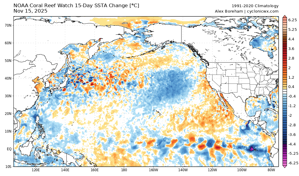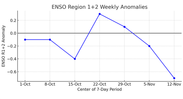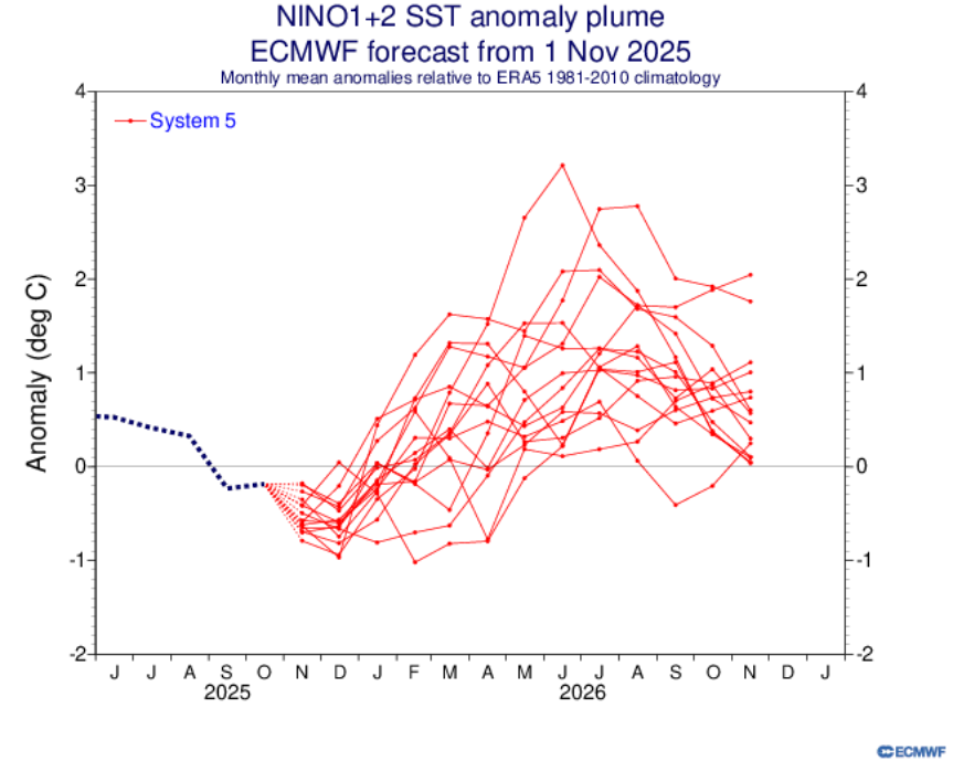 ENSO Region 1+2 has see a recent, fairly sharp cooling. This decline is in line with the ECMWF Seasonal Forecast from November 1. As a result, the development provides a measure of confidence that its forecast is on track at this point. -