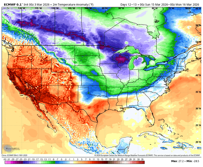 The American Storm @BigJoeBastardi · 12m Weatherbellians and you, if you have watched some of the tweets, have seen me say "beware the ides of March" for another flip to colder. Well models are seeing it. After one of the warmest front 10 days of March, look where we are by the 15th. Do not be surprised as this pattern evolves that the first 10 days or so of April are as cold in the areas that are that warm in the first 10 days of March. -