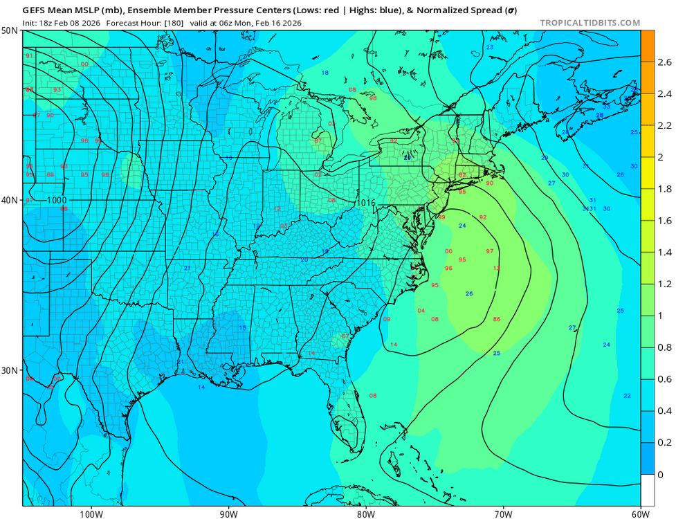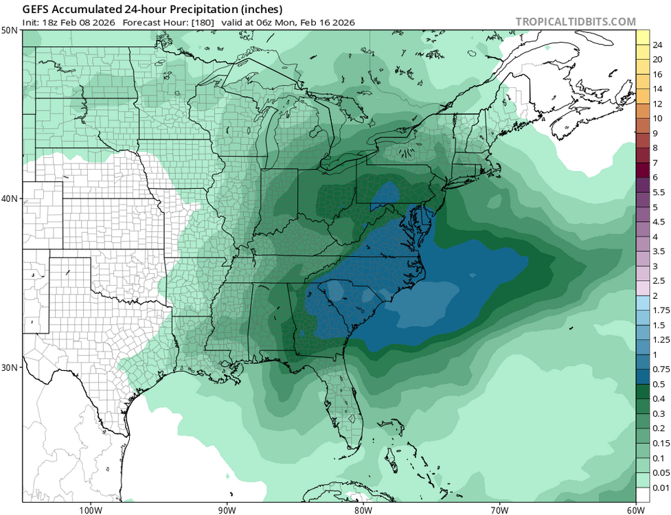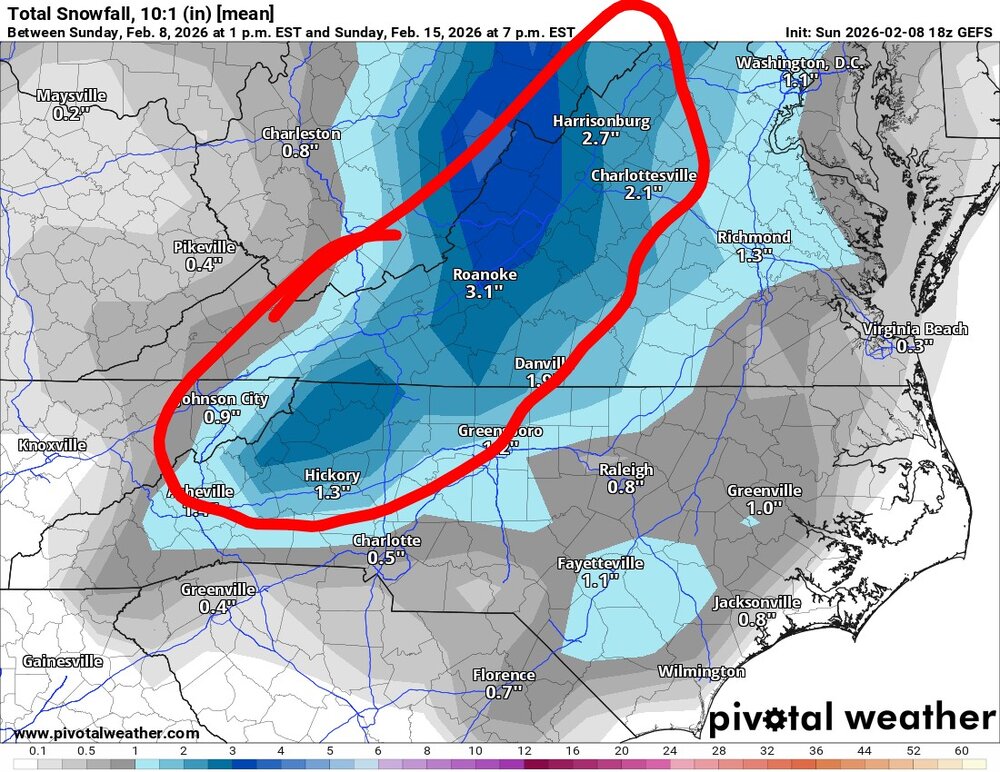 18z GEFS looking to be a little more widespread area of snow similar to the Canadian ensembles. Right now it's looking like north of 40 Foothills, mountains, throughout Western Virginia. Out of all the ensembles today, the area in red seems to be the favored area and the purple area even higher chances.