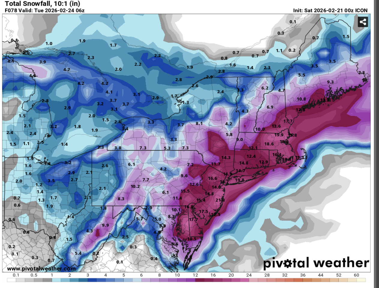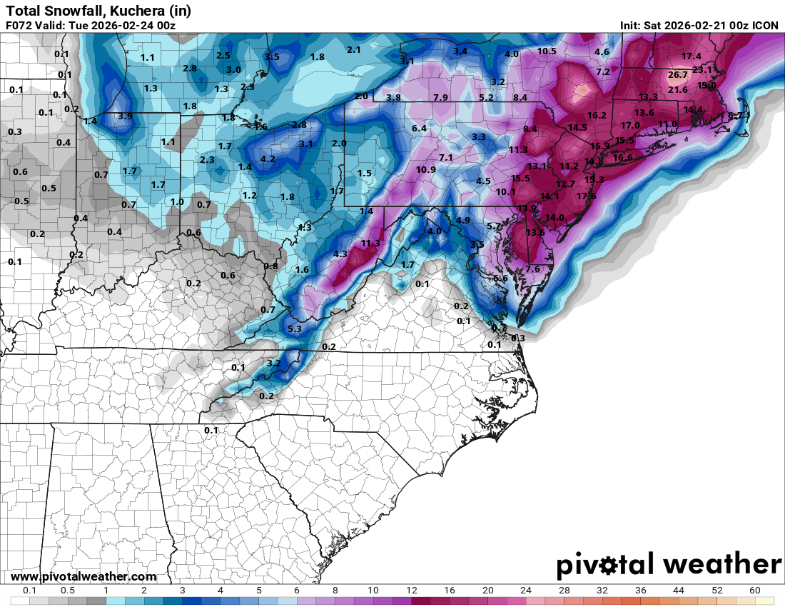 Icon is a conservative model, especially with snow from what I've gathered and since its showing this, watch out!