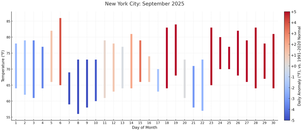 Final September mean temperature in New York City: 70.6° September 2025 had the second smallest standard deviation in temperatures for any September. Lowest Standard Deviations: 1. 1968 3.43° 2. 2025 3.63° 3. 1870 3.81° 4. 2024 3.94° 5. 1908 4.08° Standard Deviations in the New York City Area: Bridgeport: 3.60° (old record: 3.72°, 2024) Islip: 4.11° (3rd lowest) New York City-Central Park: 3.63° (2nd lowest) New York City-JFK Airport: 3.64° (2nd lowest) New York City-LaGuardia Airport: 3.82° (2nd lowest) Newark: 4.19° (3rd lowest) White Plains: 4.02° (old record: 4.28°, 1968) -