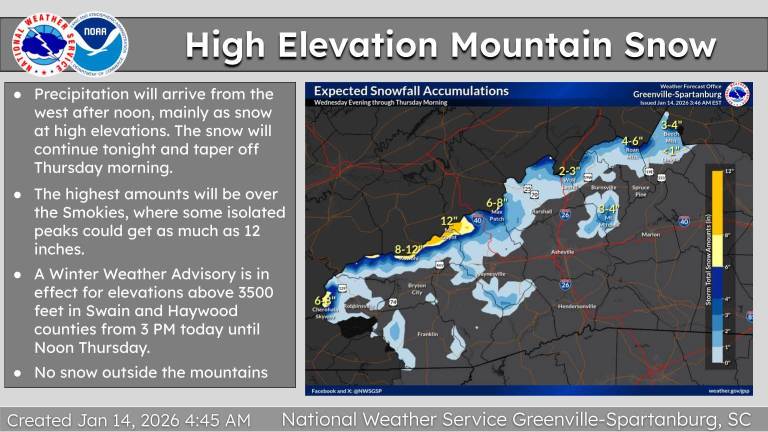 Good Lord Met1985!!! Do you have some spare rooms for people to hang out??? 2026 NCZ051-052-141430- /O.NEW.KGSP.WW.Y.0001.260114T2000Z-260115T1700Z/ Swain-Haywood- 123 AM EST Wed Jan 14 2026 ...WINTER WEATHER ADVISORY IN EFFECT FROM 3 PM THIS AFTERNOON TO NOON EST THURSDAY ABOVE 3500 FEET... * WHAT...Snow expected above 3500 feet. Total snow accumulations up to 11 inches. Winds gusting as high as 45 mph. * WHERE...Elevations above 3500 feet in Haywood and Swain Counties. * WHEN...From 3 PM this afternoon to noon EST Thursday. * IMPACTS...The heavy snow will make many roads impassable and may produce widespread power outages due to the weight of the snow on tree limbs and power lines. The hazardous conditions could impact the Wednesday evening and Thursday morning commutes. Gusty winds could bring down tree branches. -