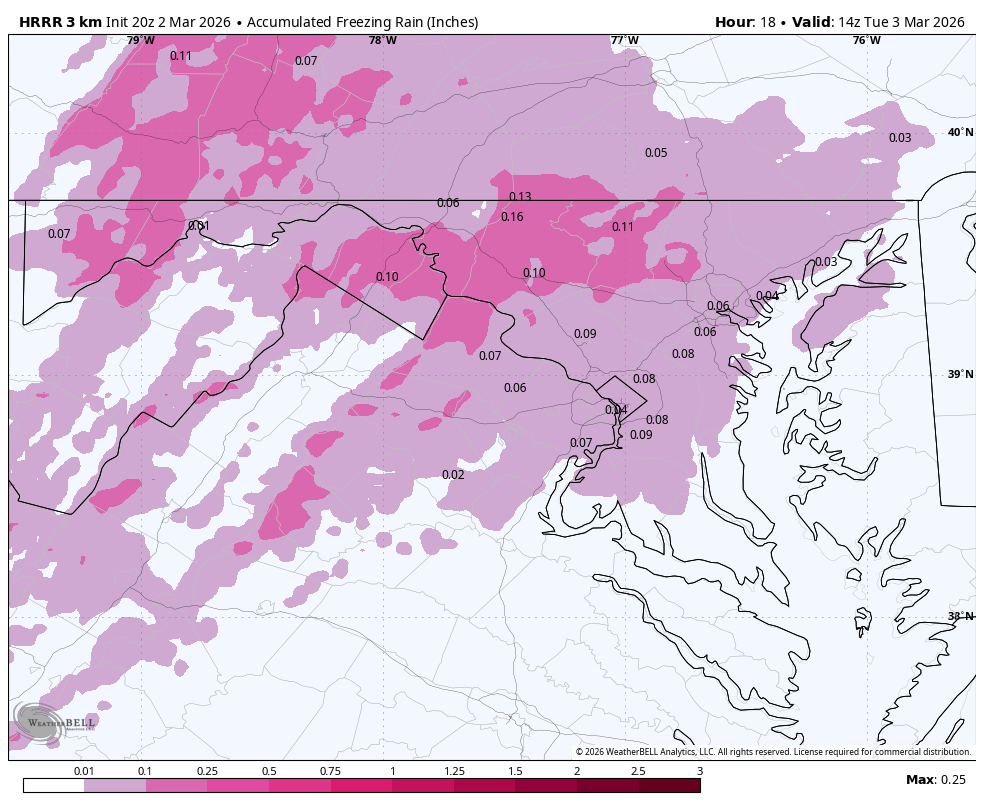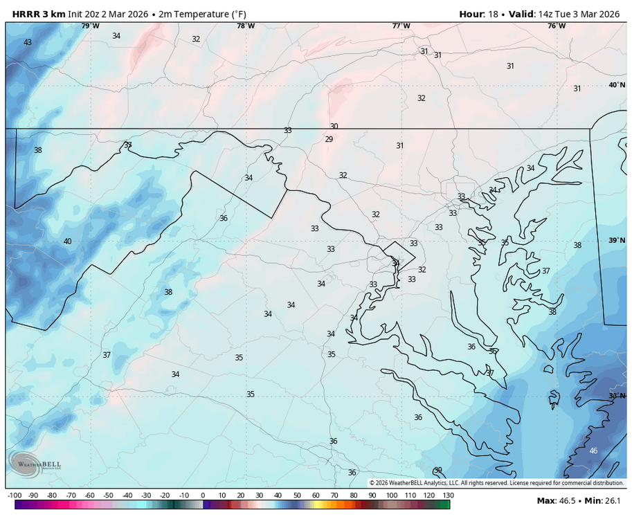 Special Weather Statement National Weather Service Baltimore MD/Washington DC 930 AM EST Mon Mar 2 2026 DCZ001-MDZ013-014-503>506-VAZ039-040-051-053-054-501-502-505-506- 526-527-022030- District of Columbia-Prince Georges-Anne Arundel- Northwest Montgomery-Central and Southeast Montgomery- Northwest Howard-Central and Southeast Howard-Madison- Rappahannock-Culpeper-Fairfax-Arlington/Falls Church/Alexandria- Northern Fauquier-Southern Fauquier-Western Loudoun- Eastern Loudoun-Northwest Prince William- Central and Southeast Prince William/Manassas/Manassas Park- Including the cities of Washington, Bowie, Suitland-Silver Hill, Clinton, College Park, Greenbelt, Laurel, Camp Springs, Glen Burnie, Annapolis, Severn, South Gate, Severna Park, Arnold, Odenton, Germantown, Damascus, Bethesda, Rockville, Gaithersburg, Silver Spring, Lisbon, Columbia, Ellicott City, Madison, Culpeper, Reston, Herndon, Annandale, Centreville, Chantilly, McLean, Franconia, Arlington, Alexandria, Falls Church, Warrenton, Turnbull, Purcellville, Leesburg, Ashburn, Sterling, Haymarket, Dale City, Manassas, Woodbridge, Lake Ridge, and Montclair 930 AM EST Mon Mar 2 2026 ...LIGHT SNOW EXPECTED MIDDAY AND AFTERNOON... * WHAT...Snow midday and afternoon, accumulating around an inch on unpaved surfaces. Some slushy accumulation on paved surfaces possible. * WHERE...The Washington Metropolitan area, northern Virginia, and central Maryland. * WHEN...The steadiest snow is expected between noon and 5 PM this afternoon. * IMPACTS...In bands of heavier snow, road surfaces may become slushy or even snow covered for a brief period this afternoon. For this evening, any standing water or slush may freeze with temperatures around 30 to 32 degrees.