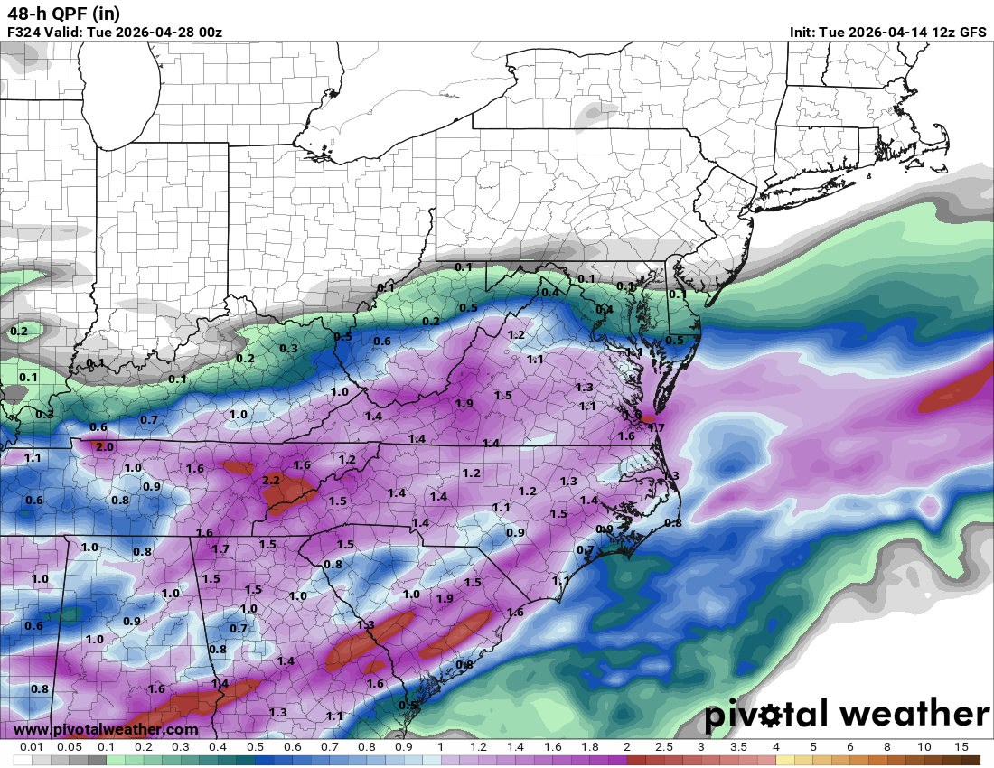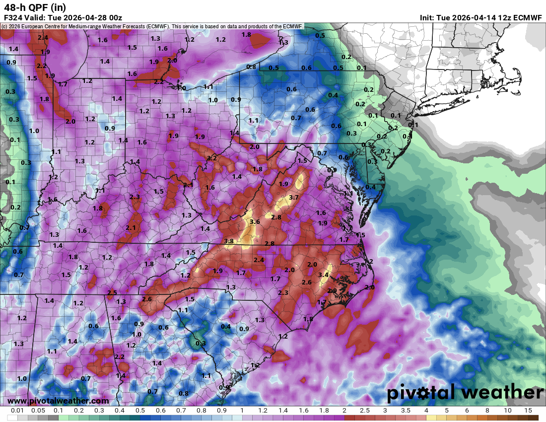 75 / 57 the 6.6 day strong warmup entering its peak mid 80s to low 90s in the area, with many records possible today- Friday. Cold front comes through at some point Sunday and could see a 30-40 degree swing from Sunday max to Monday lows (4/19) - (4/20). Storms could trend stronger for Sunday as well. Cooler next week with temps falling near to below noram as trough into the northeast - onshore flow backing in, we'll see if we turn wetter. Beyond there moderation as we approach early May. 4/13 - 4/19 : Warm to very warm +10 - +20 period, record warmth, first 90s, mainly dry 4/20 - 4/30 : Below normal overall - wetter 5/1 - beyond : Near normal - moderation