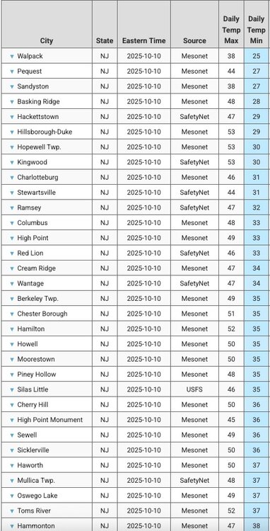 54 / 37 from 36. Fall is in the air. Clouds moving in from the ocean but partly cloudy overall. Clouds look to build in Sat - Tue as he cutoff and coastal meander offshore. Complex storm much discussed in the other thread 1 - 3 inches Between Sunday - Tue nigh, Euro lingers the longest and drops most rain Tue / Wed AM. Clear out and dries out Wed and through the end of the week and next weekend. Ridging comes northeast but overall near normal beyond.