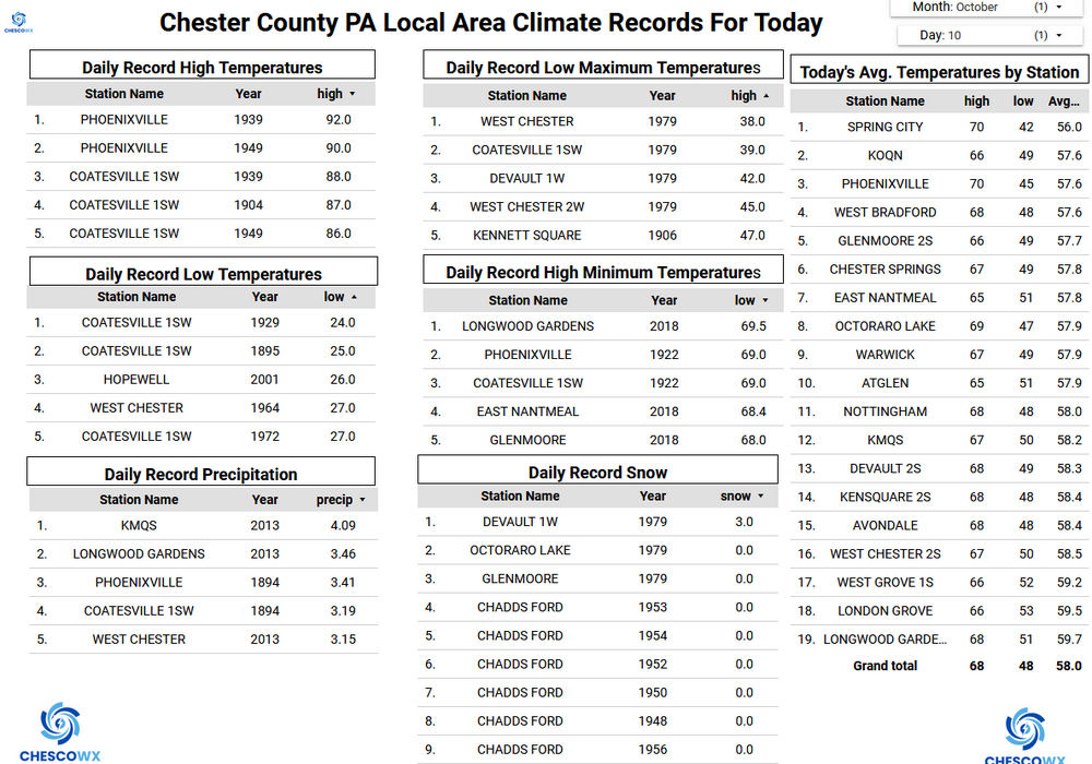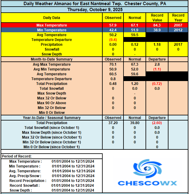 Many spots below 400 feet ASL saw freezing temperatures this morning across Chester and Berks counties. Freezing temperatures were recorded at West Chester, Chester Springs, West Bradford Twp. Devault, Warwick Township and Nottingham. The coldest reading was the 28.9 degrees at Warwick. Here in East Nantmeal at 685 feet ASL we recorded a low of 37.5. This is a record low for this date for this location with records since 2004. Regarding the weekend coastal storm some models have backed off a bit on the westward extent of the heaviest rain across Chester and Berks counties. Rain chances start to increase by tomorrow evening, and showers could continue into Monday. -