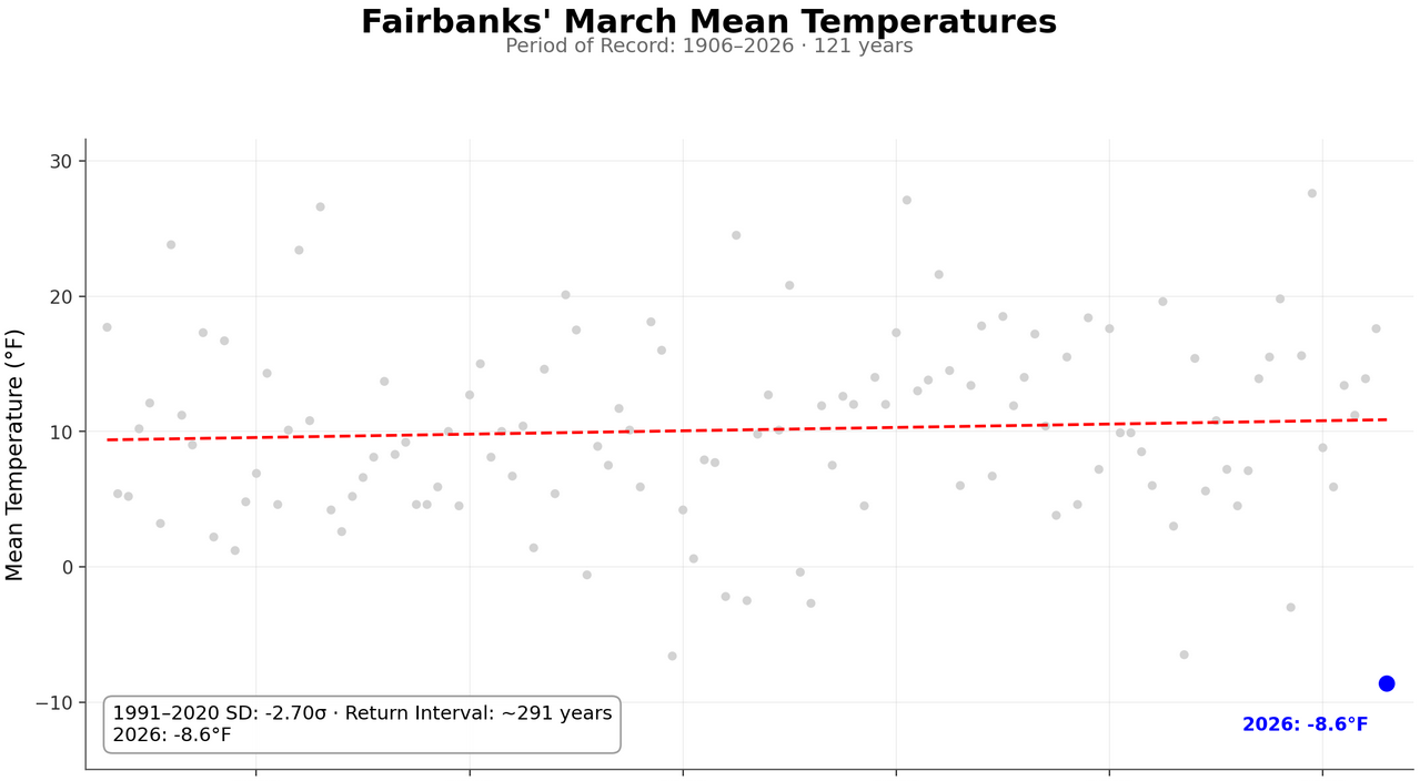 Using a chart inspired by Jeff Berardelli's return-time charts, here's how Fairbanks would look for March 2026: -