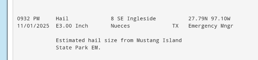3 in. hailstones reported Saturday evening over the Coastal Bend. Could've definitely been slightly larger given all the abnormally far south colder mid-level air & dynamics in place over the region that evening. - Today
