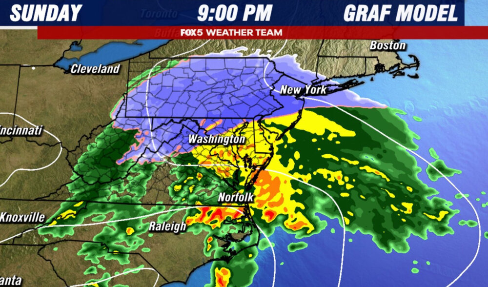 this isn't exact science but because of the Bermuda High pressure being stronger than modeled and trending even stronger could phase the northern stream and cause the snow to break out for 6-8 hours between this area! -