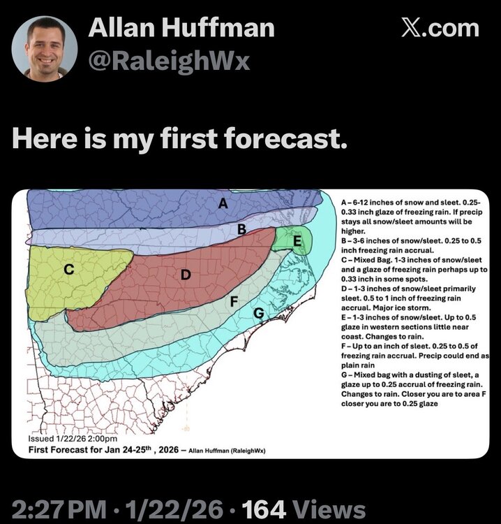 1/25-26 First Call Snowfall Forecast From the JV Team Hopefully the map is pretty self-explanatory. That thick blue line is the dividing line between all snow and mixing. Tonight this forecast will be refined. This will likely be the most impactful winter storm in the DMV region since 2016, even though mixing with sleet and freezing rain will occur. Temperatures will be cold throughout the storm and will struggle to reach 25. Snowfall ratios at the beginning of the storm will likely be around 16:1 and will slowly decrease to around 9:1, before mixing, where freezing rain and sleet will make conditions all the more dangerous. Snowfall rates during the heaviest returns will be upwards of 1-2" per hour, occasionally reaching 3" in isolated areas (which are currently unknown as we are too far out for CAMs to realistically hone in on those areas) where h7 FGEN goes crazy (credit to @MillvilleWx). After the storm, temperatures will remain frigid, and it's unlikely that high temperatures reach above freezing until February. Your snow/sleet/ice will turn into glacier. Prepare now. Make sure to get all your essential needs, like food, water, and a source of heat if your power goes out due to the ice.