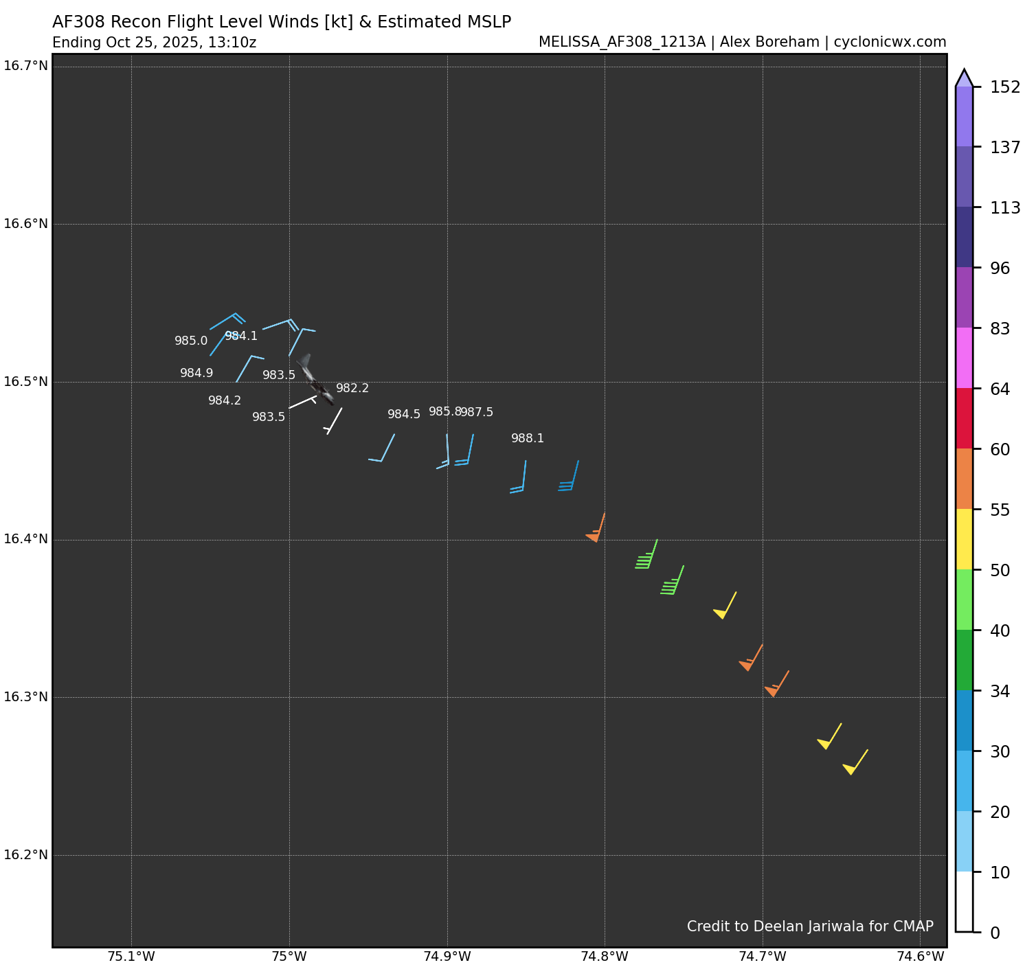 8:27 AM EDT: 986 mb very near H status 943 URNT12 KWBC 251227VORTEX DATA MESSAGE AL132025A. 25/12:03:08ZB. 16.41 deg N 074.88 deg WC. NAD. 986 mbE. 195 deg 16 ktF. OPEN SWG. C18H. NAI. NAJ. 167 deg 65 ktK. 067 deg 10 nm 12:00:31ZL. NAM. NAN. 325 deg 46 ktO. 242 deg 13 nm 12:06:34ZP. 14 C / 2460 mQ. 21 C / 2443 mR. 15 C / NAS. 12345 / NAT. 0.01 / 1 nmU. NOAA2 1113A MELISSA OB 14MAX FL WIND 68 KT 299 / 16 NM 10:47:30Z